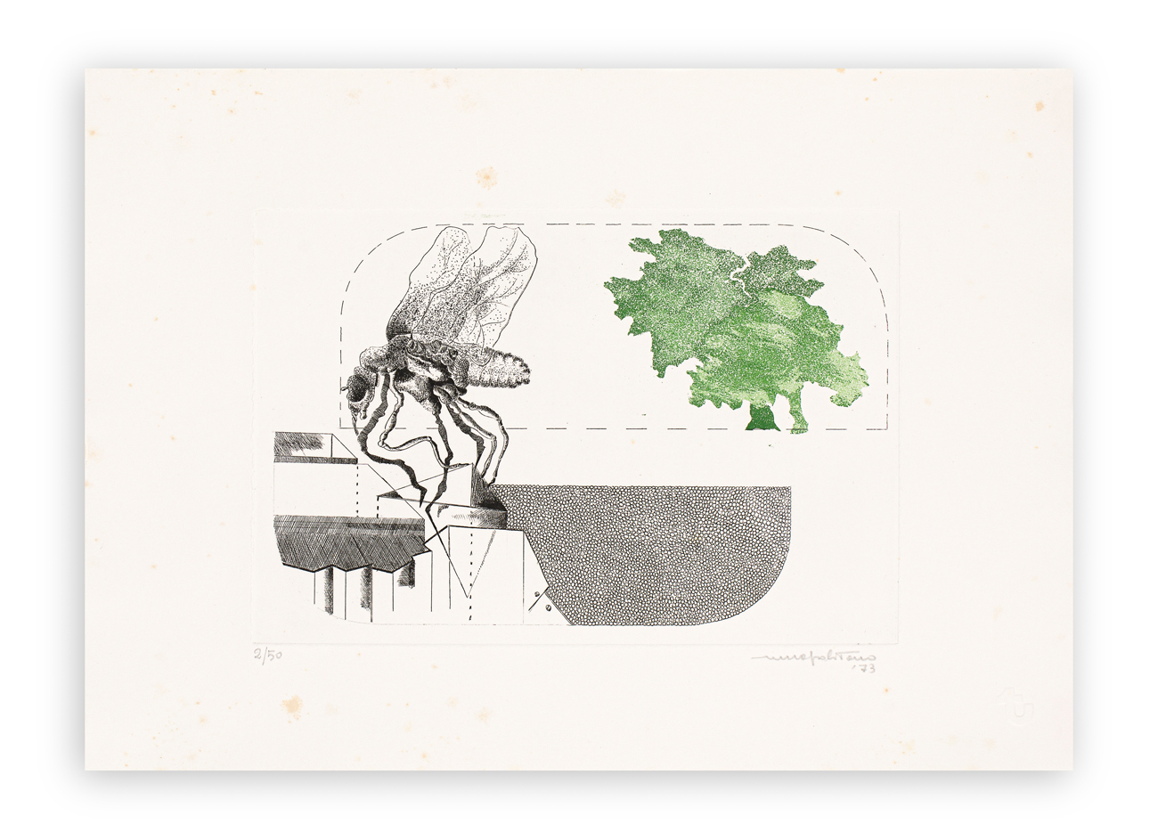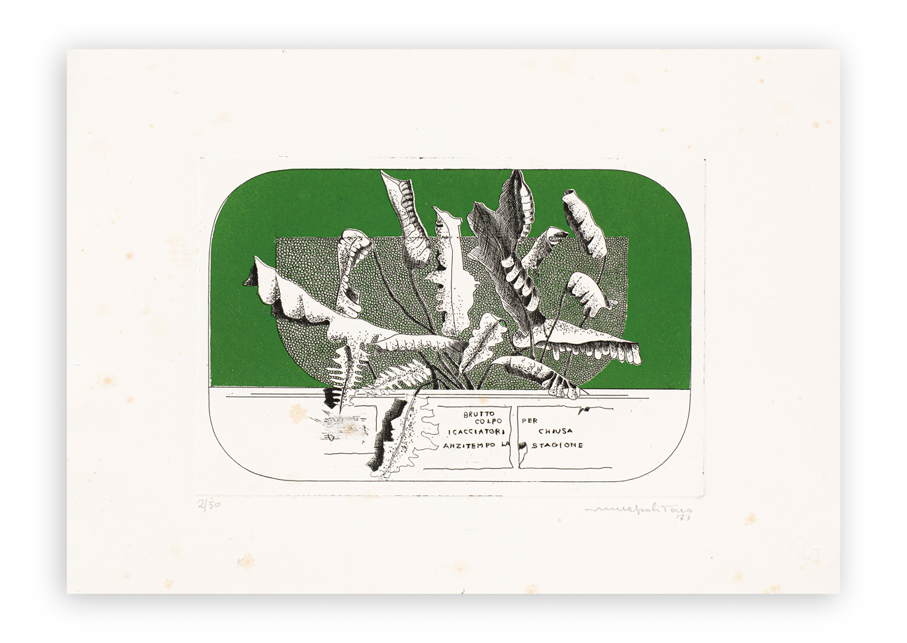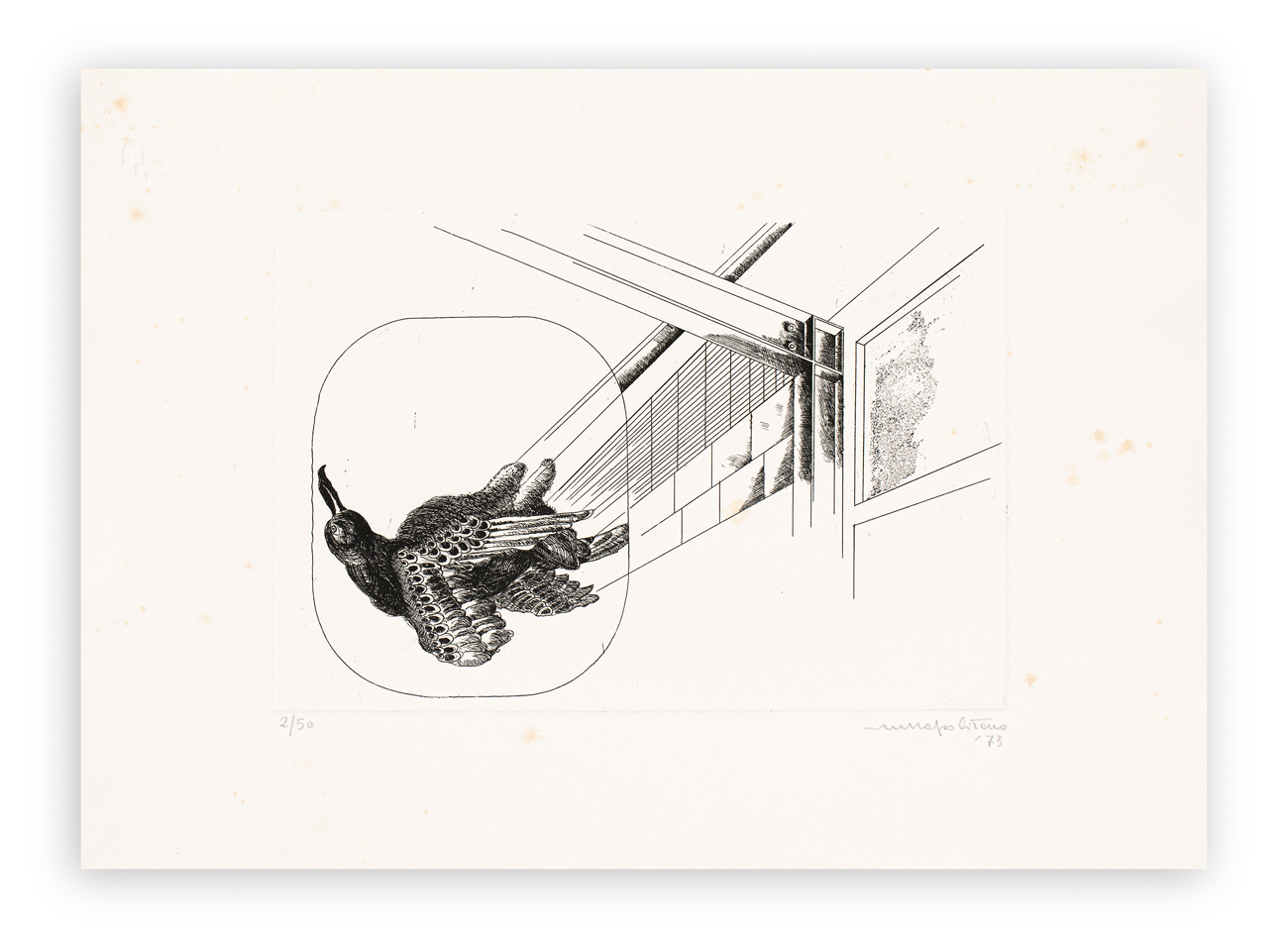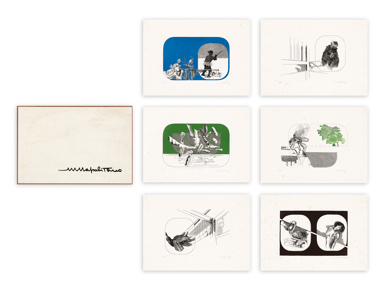 Cartella contenente testo di presentazione di Elio Mercuri e 6 acqueforti, ciascuna recante firma, datazione e numerazione (Esemplari 2/50) a matita al fronte e timbro a secco dello Stampatore