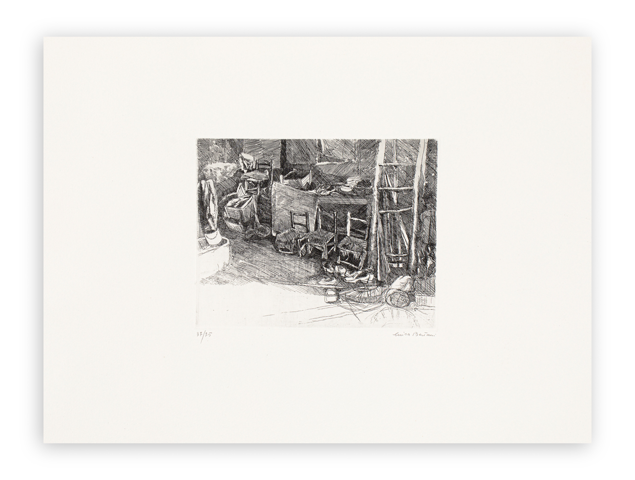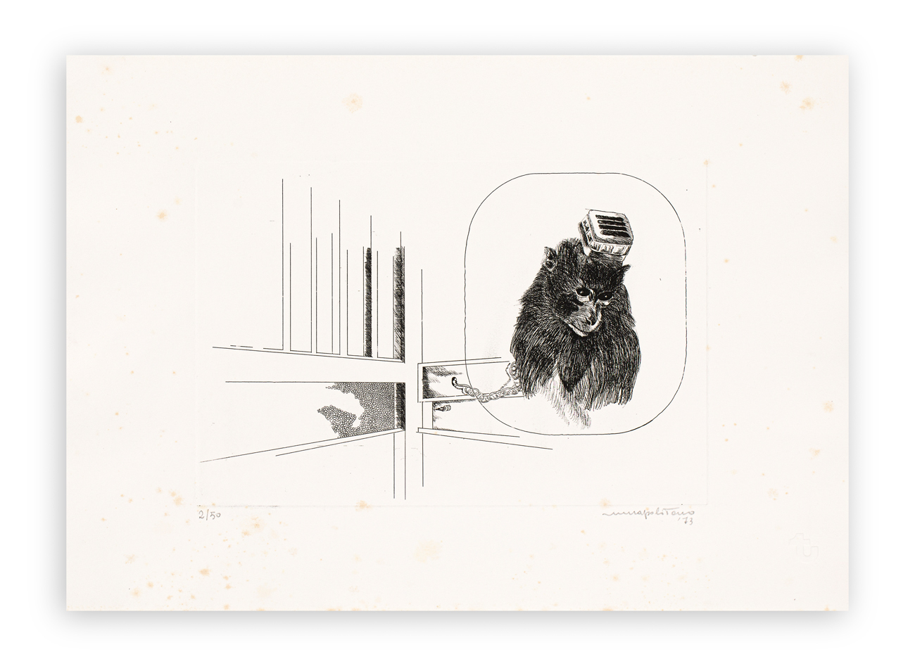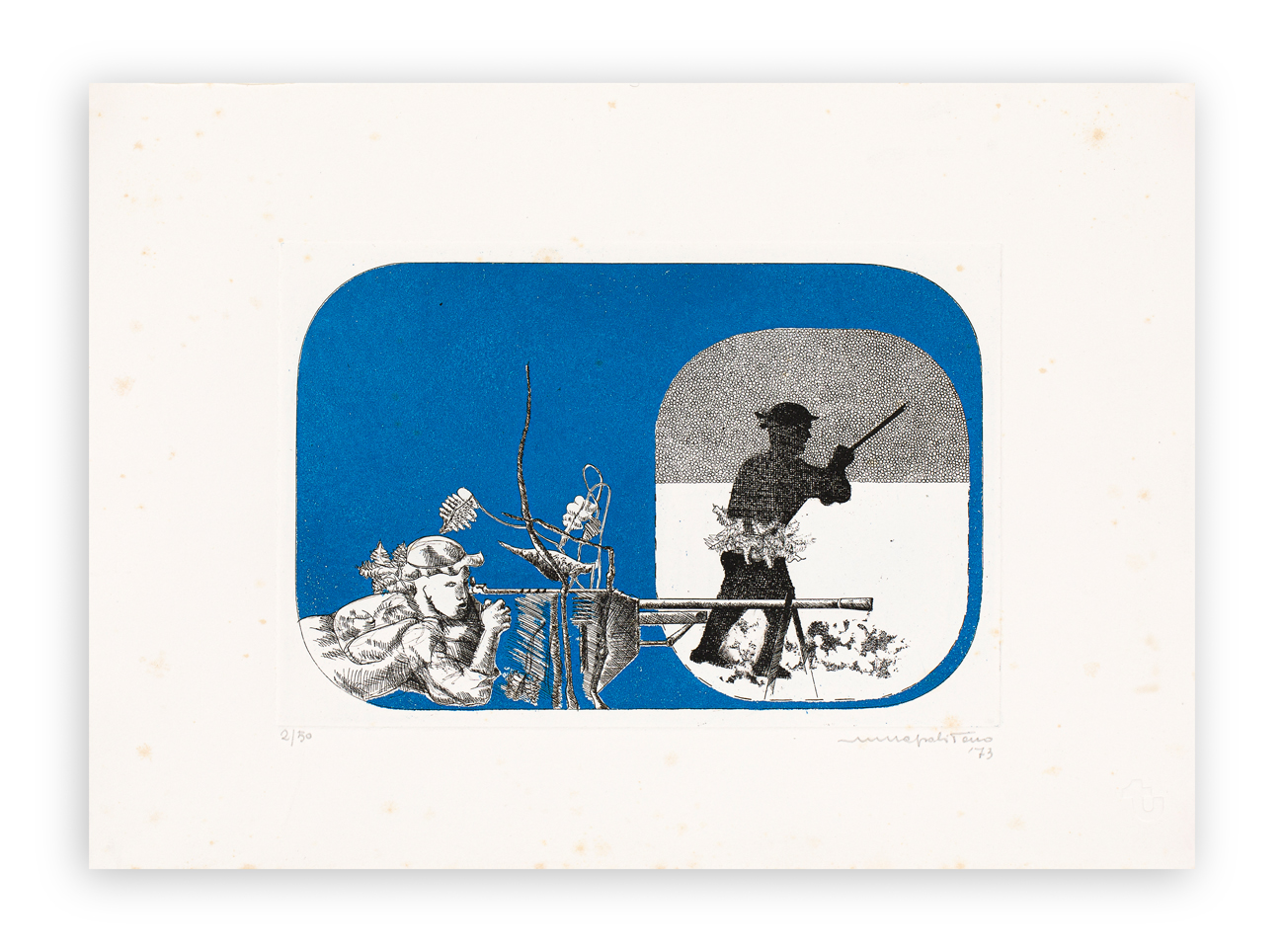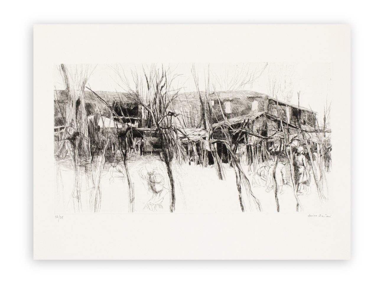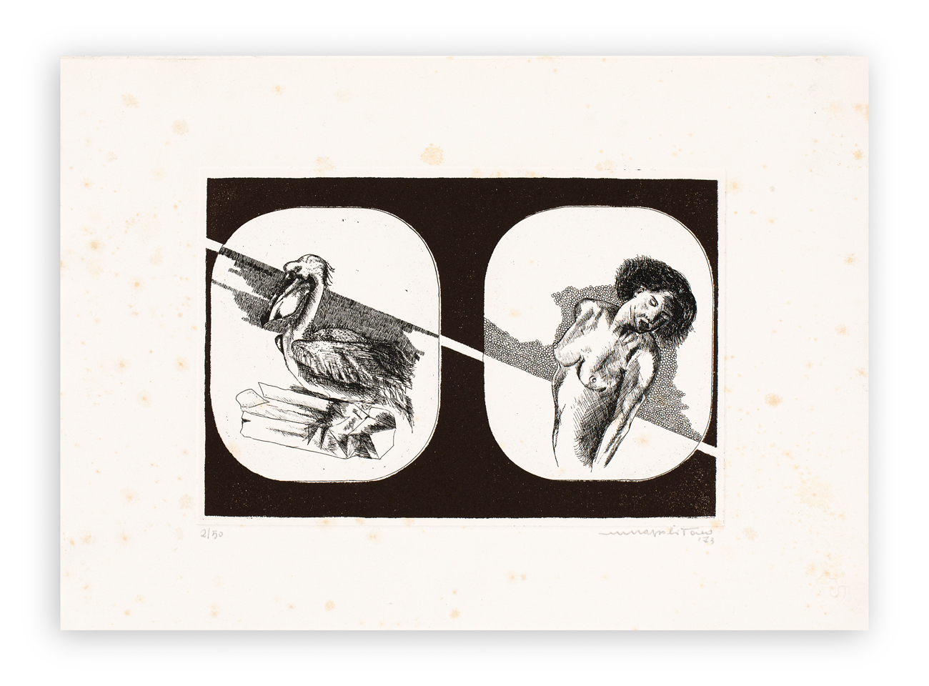 Cartella contenente testo di presentazione di Elio Mercuri e 6 acqueforti, ciascuna recante firma, datazione e numerazione (Esemplari 2/50) a matita al fronte e timbro a secco dello Stampatore