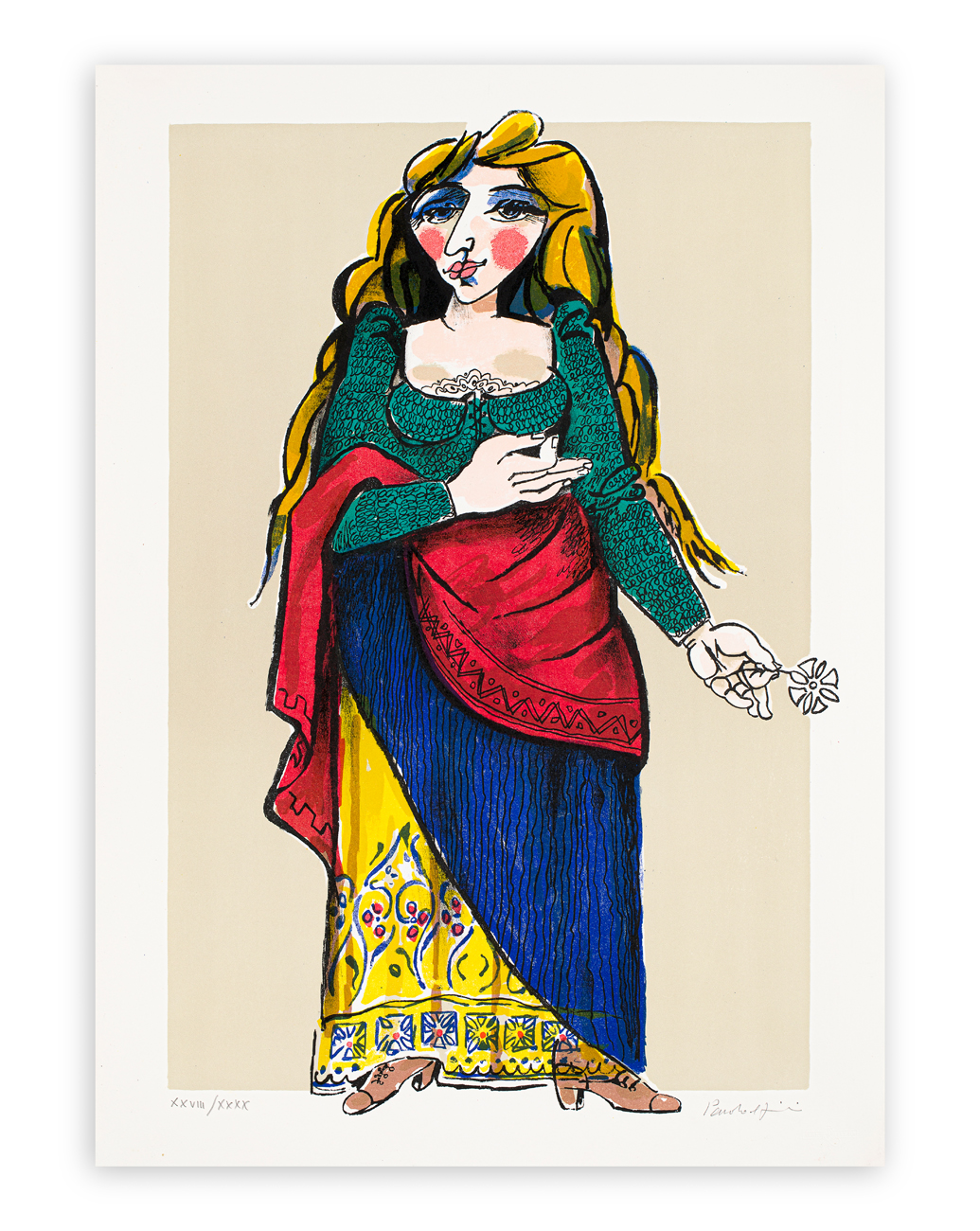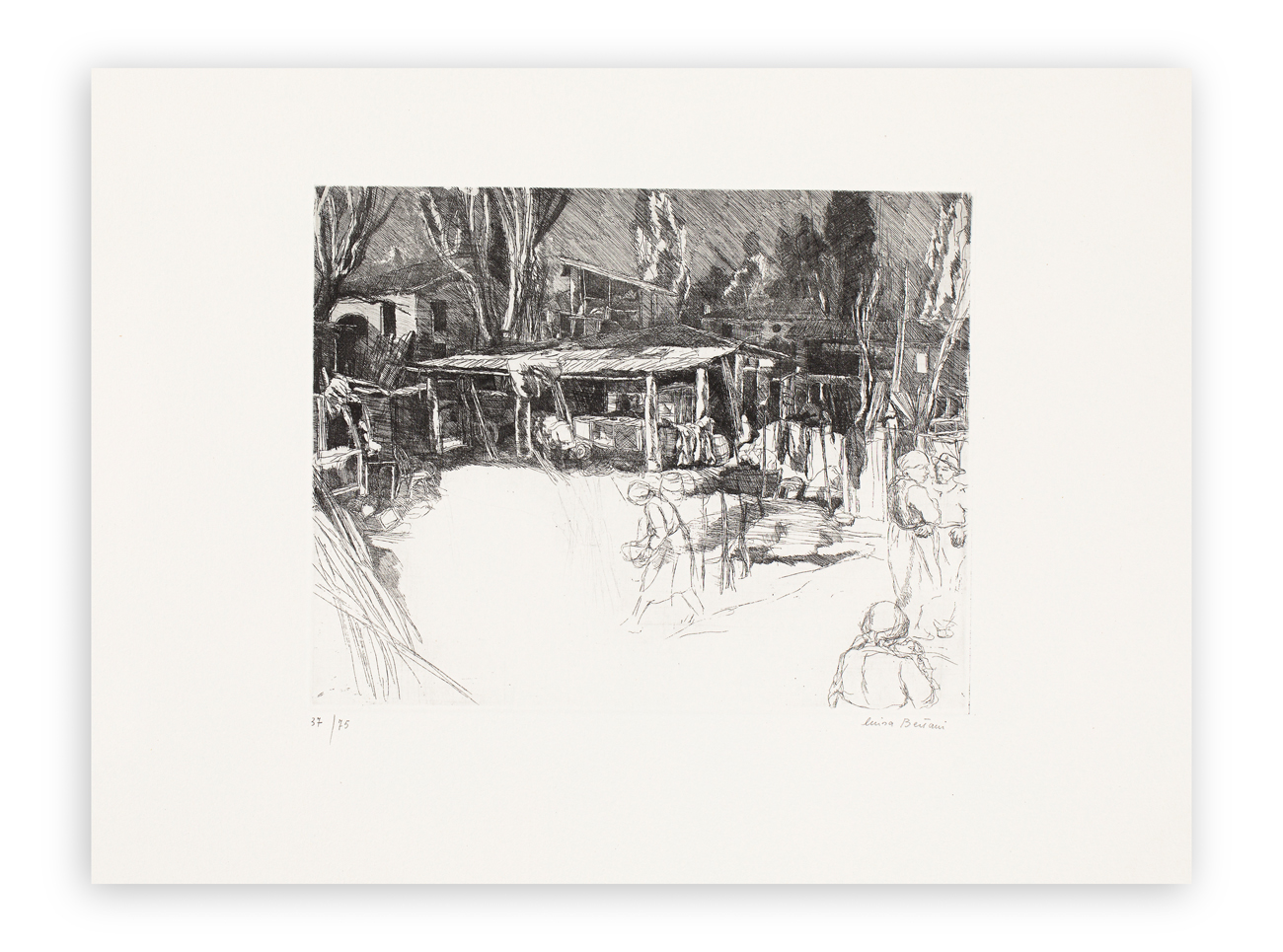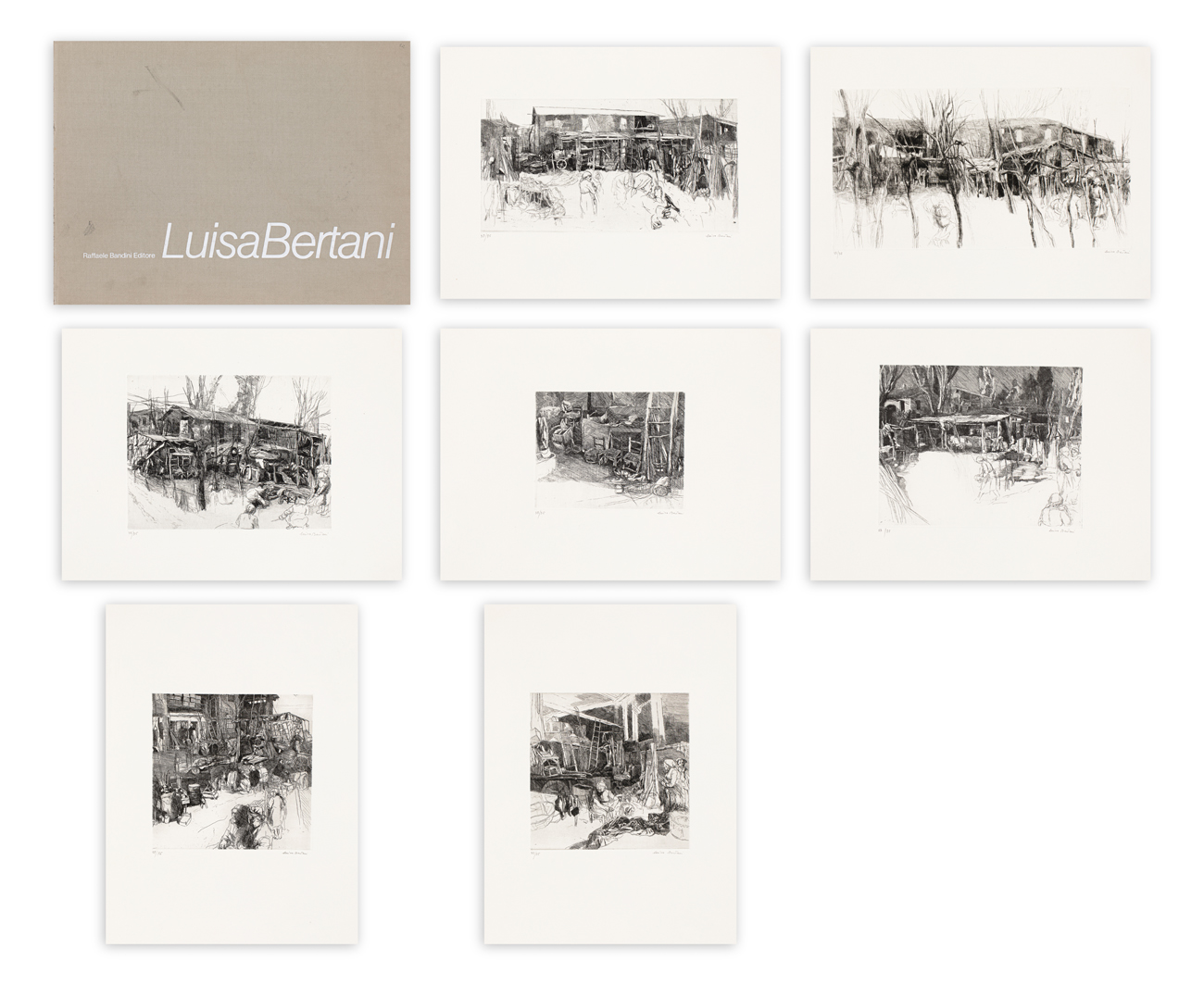 Cartella contenente testo di presentazione di Raffaele de Grada e 7 incisioni di Luisa Bertani, ciascuna recante firma e numerazione (Esemplari 37/75) a matita al fronte