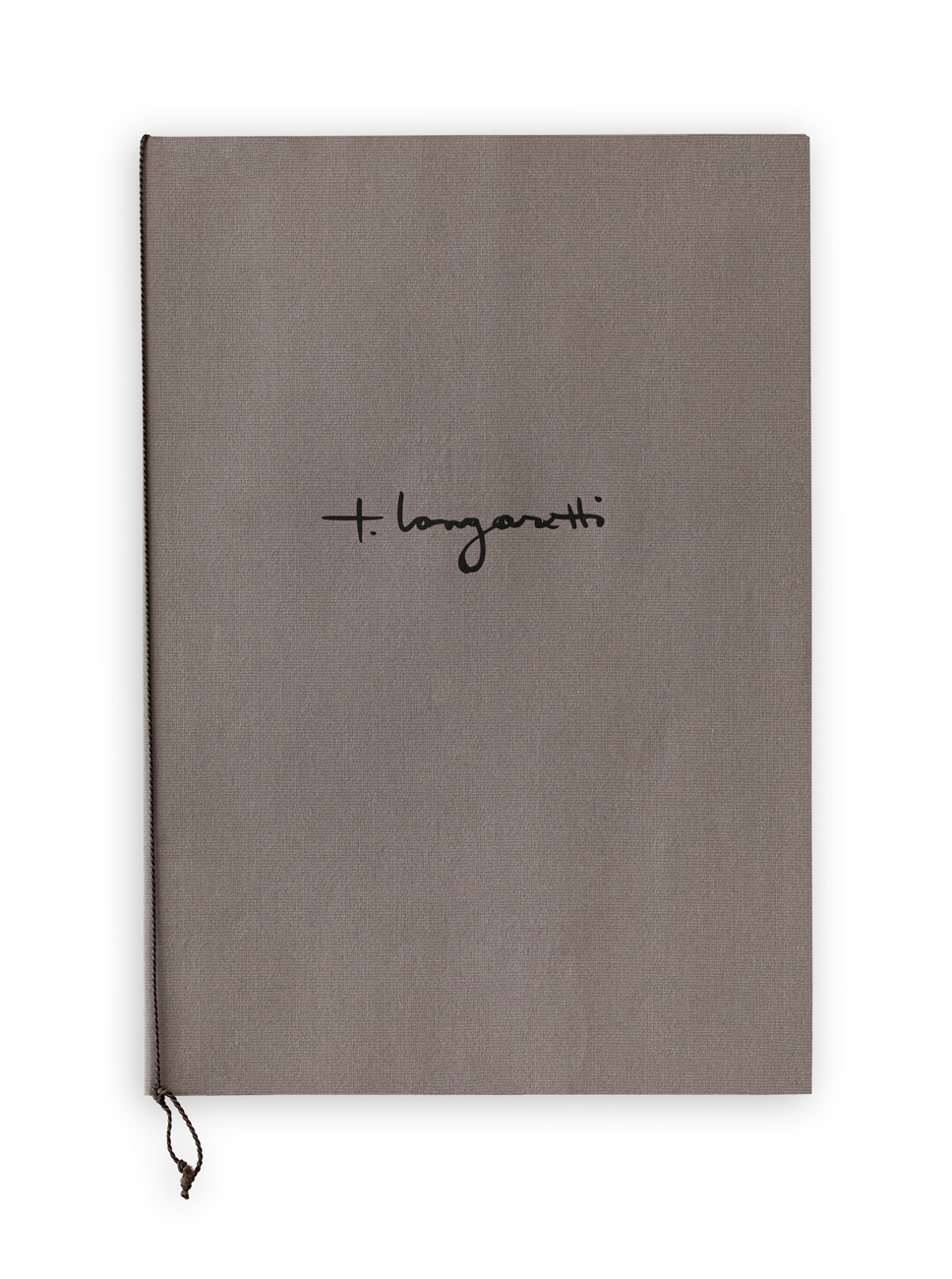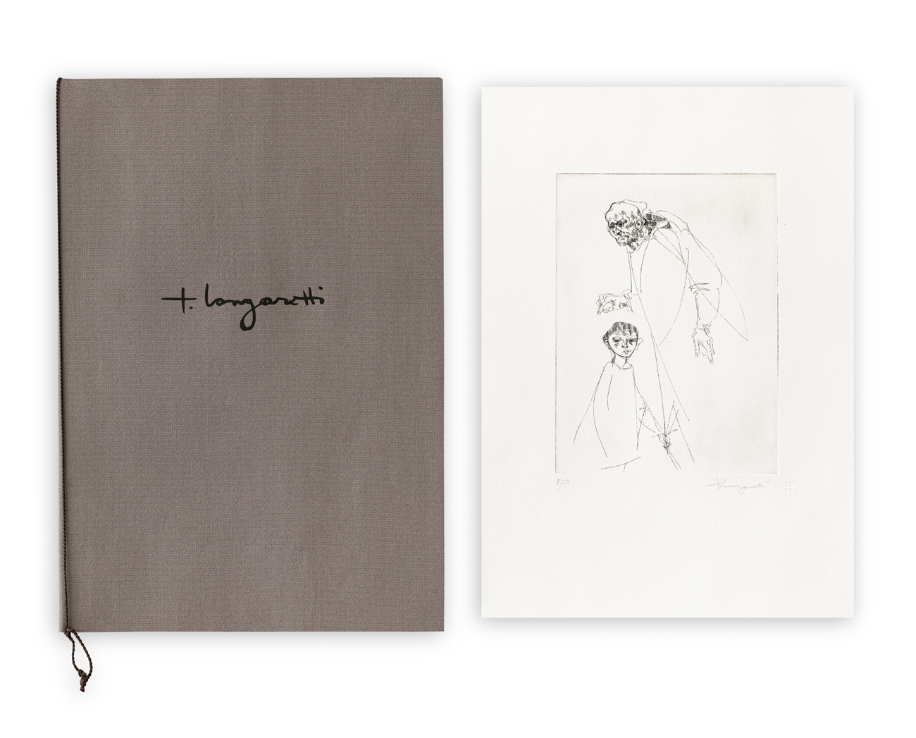 Cartella contenente colophon di presentazione e un'acquaforte di Trento Longaretti recante firma e numerazione (Esemplare 8/25) a matita al fronte e timbro a secco della Galleria 38 - Bergamo