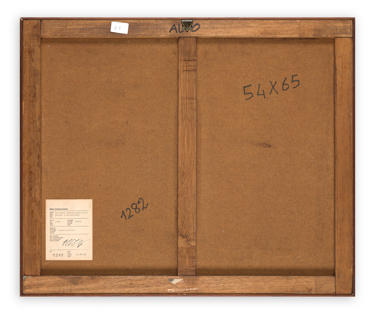 Etichetta dell'Artista al retro con firma, titolo, tecnica, misure, datazione e numero di repertorio