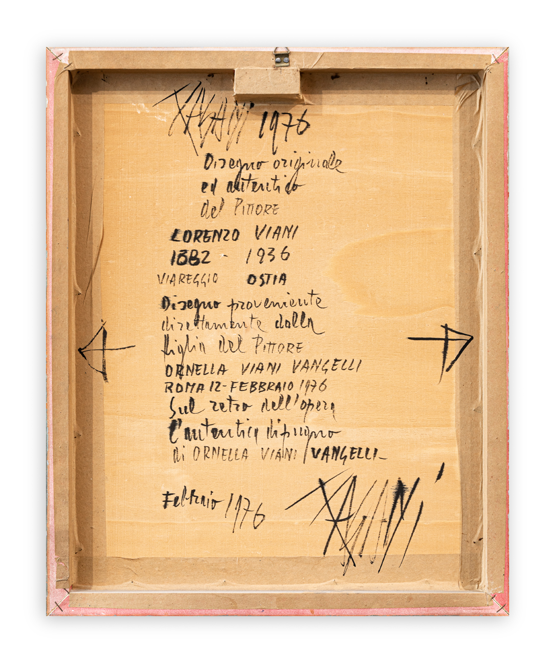 Dichiarazione di autenticità di Ornella Viani Vangelli, figlia dell'Artista, al retro