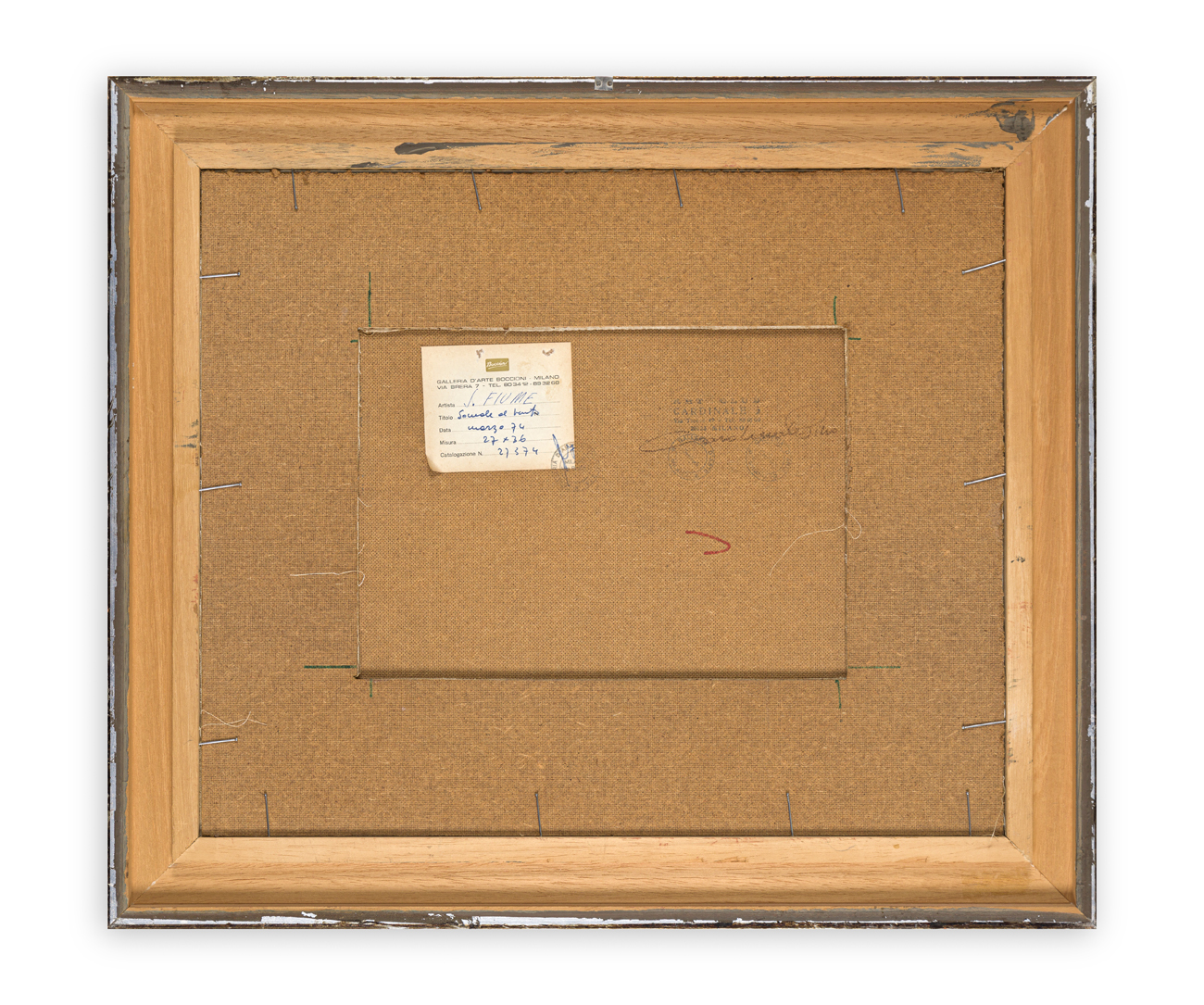 Etichetta e timbro della Galleria d'Arte Boccioni (MI) al retro con numero di catalogazione