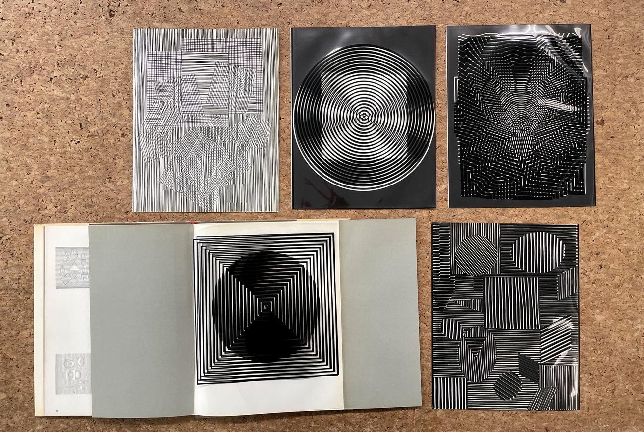 Il catalogo contiene all'interno 5 stampe su acetato e 5 ulteriori stampe sciolte su cartoncino che, sovrapposte, creano effetti ottici legati alla percezione visiva