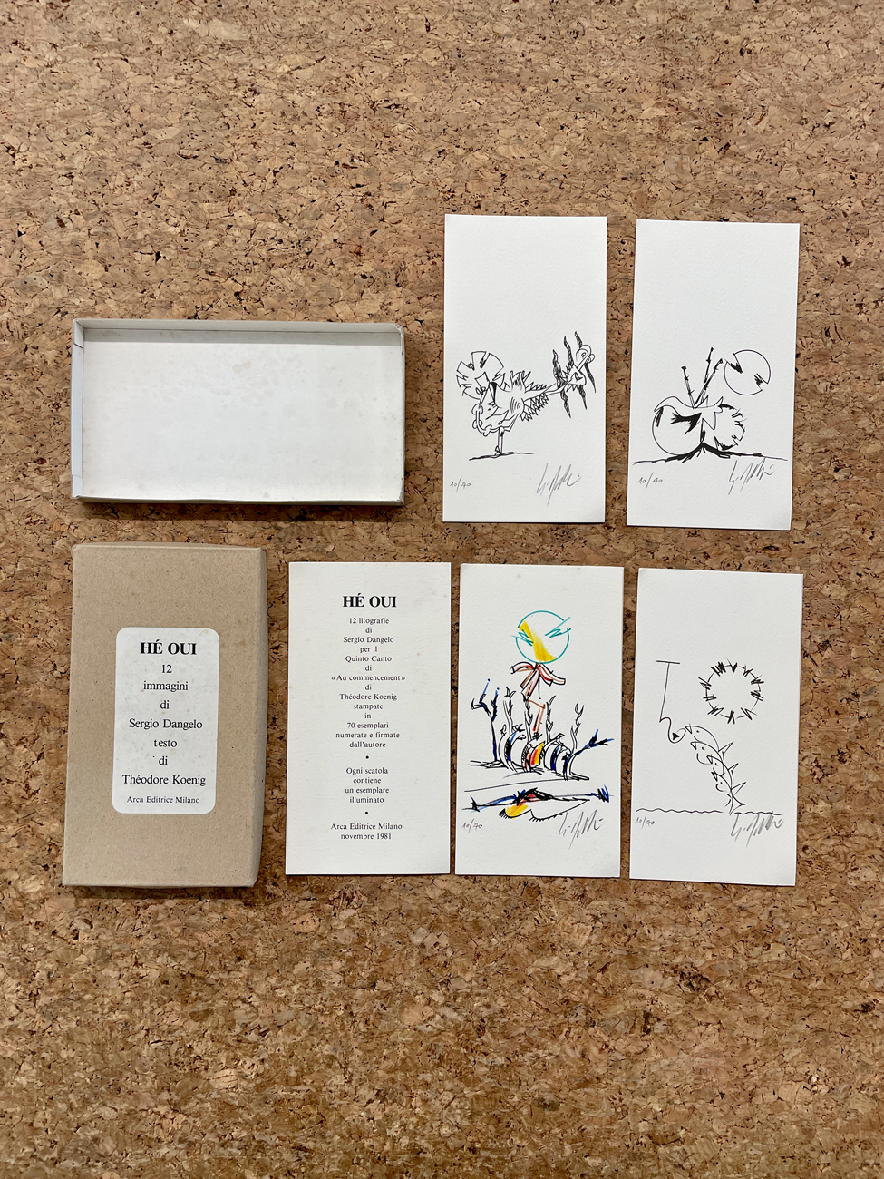 Piccola cartella contenente testo di Théodore Koenig e 12 litografie di Sergio Dangelo, ciascuna recante firma e numerazione (Esemplari 10/70) a matita al fronte