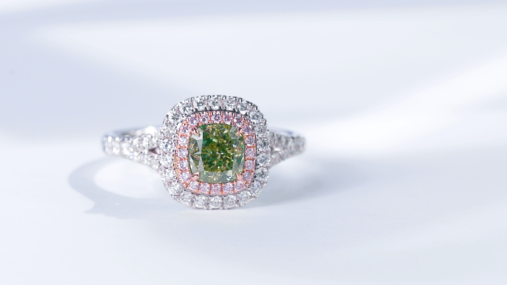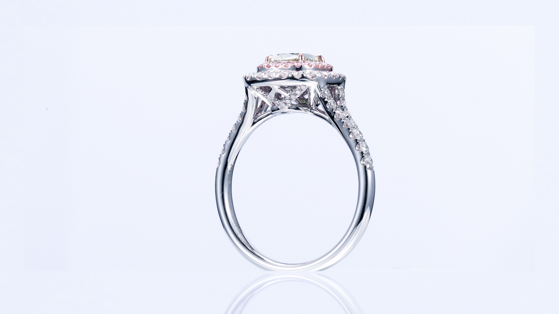 ANELLO IN ORO BIANCO 18K 4.44 GR DIAMANTE CENTRALE 1.00 CT VERDE GIALLOGNOLO GRIGIASTRO VVS2 + BRILLANTI ROSA PER 0.09 CT/20P + BRILLANTI PER: 0.44 CT/69P COLORE D-FPUREZZA VS2 CERTIFICATO GIA - SG-7841