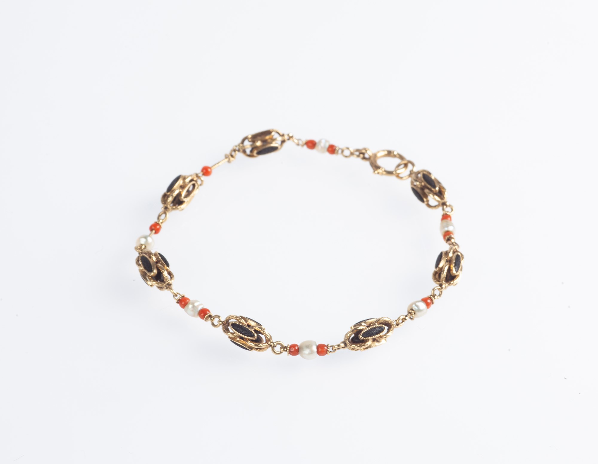 Bracciale antico in oro corallo e perle Lunghezza cm 17