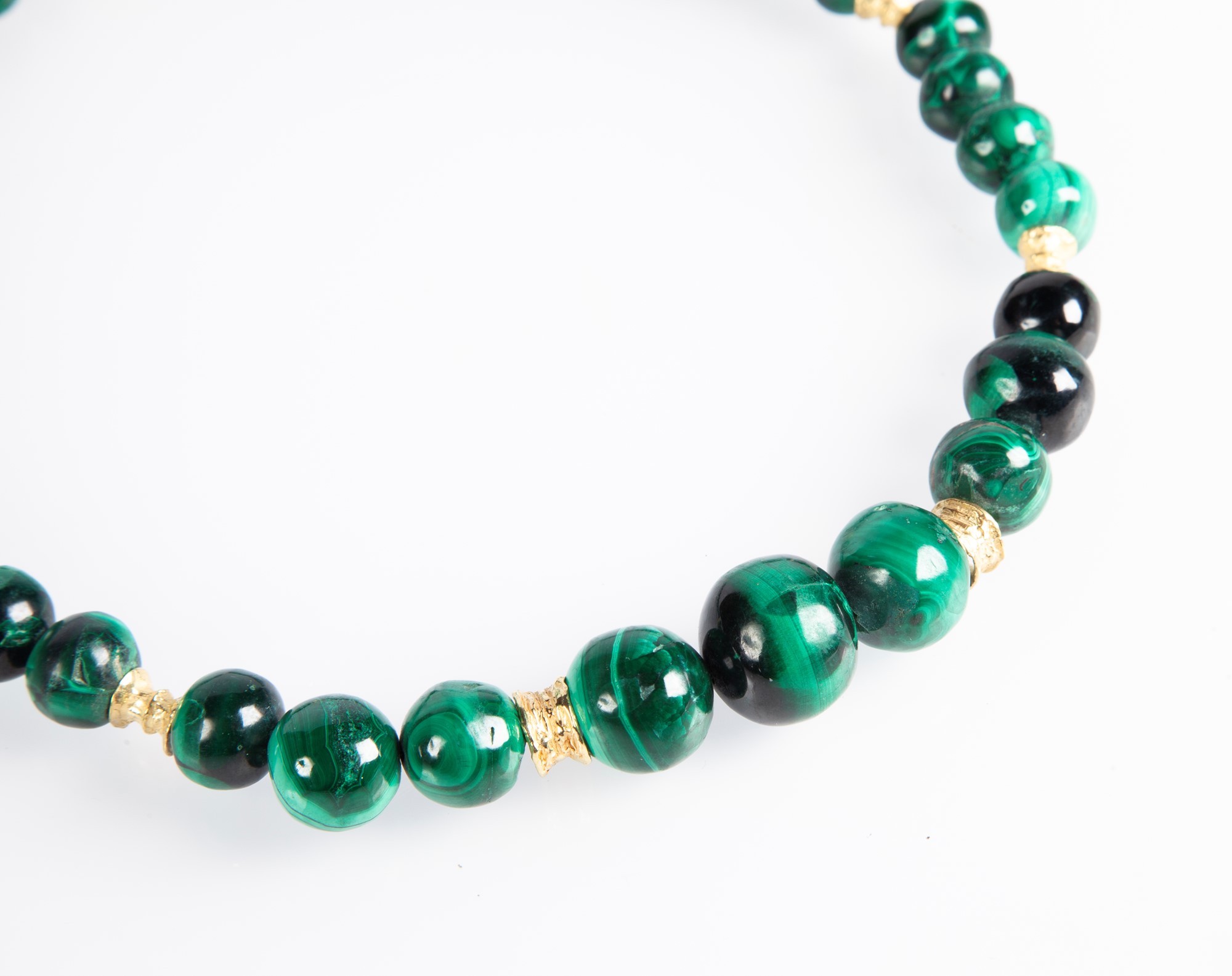 Oro giallo 750/000, malachite taglio sferico da mm. 9 a mm. 19. Peso complessivo gr. 166