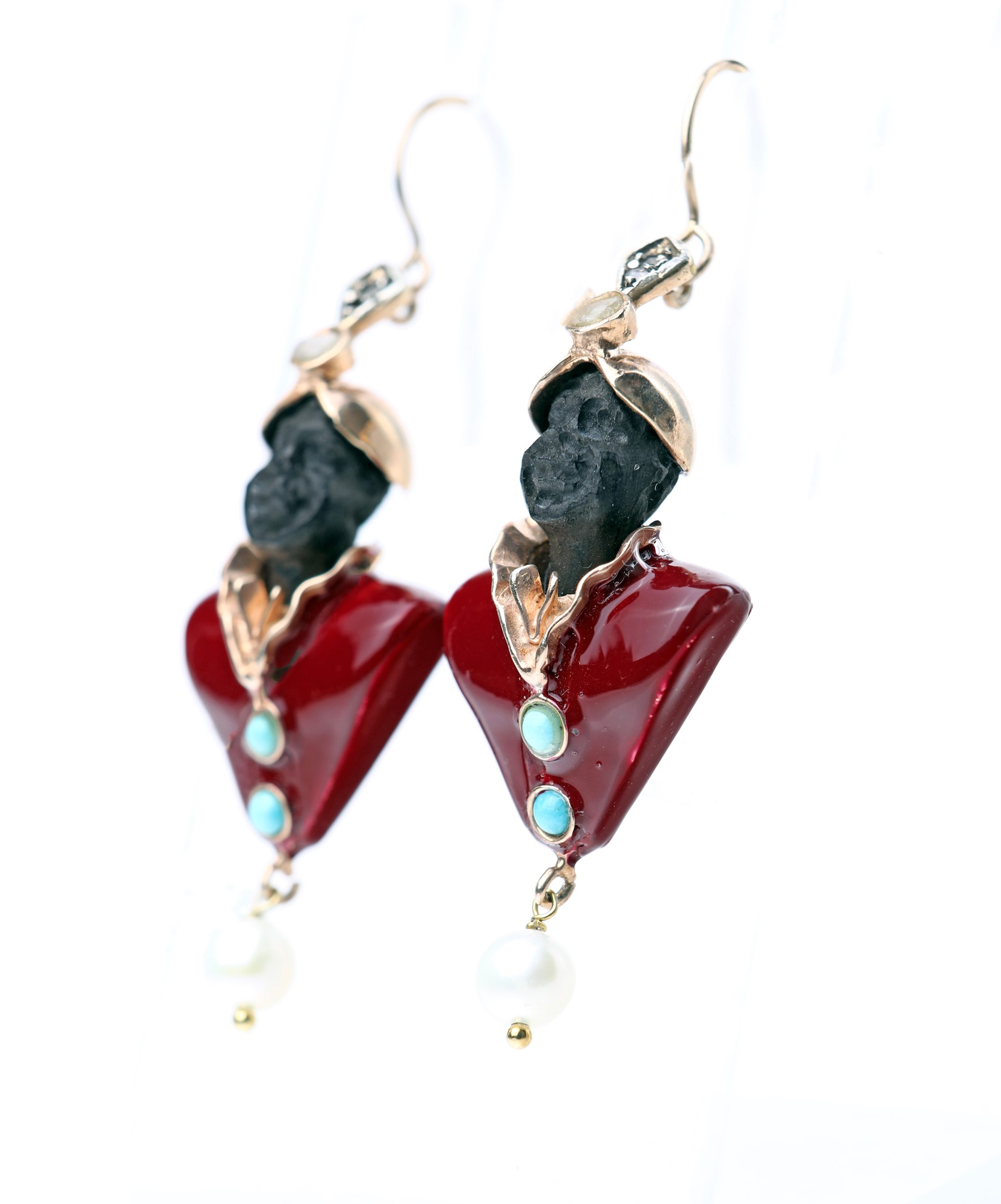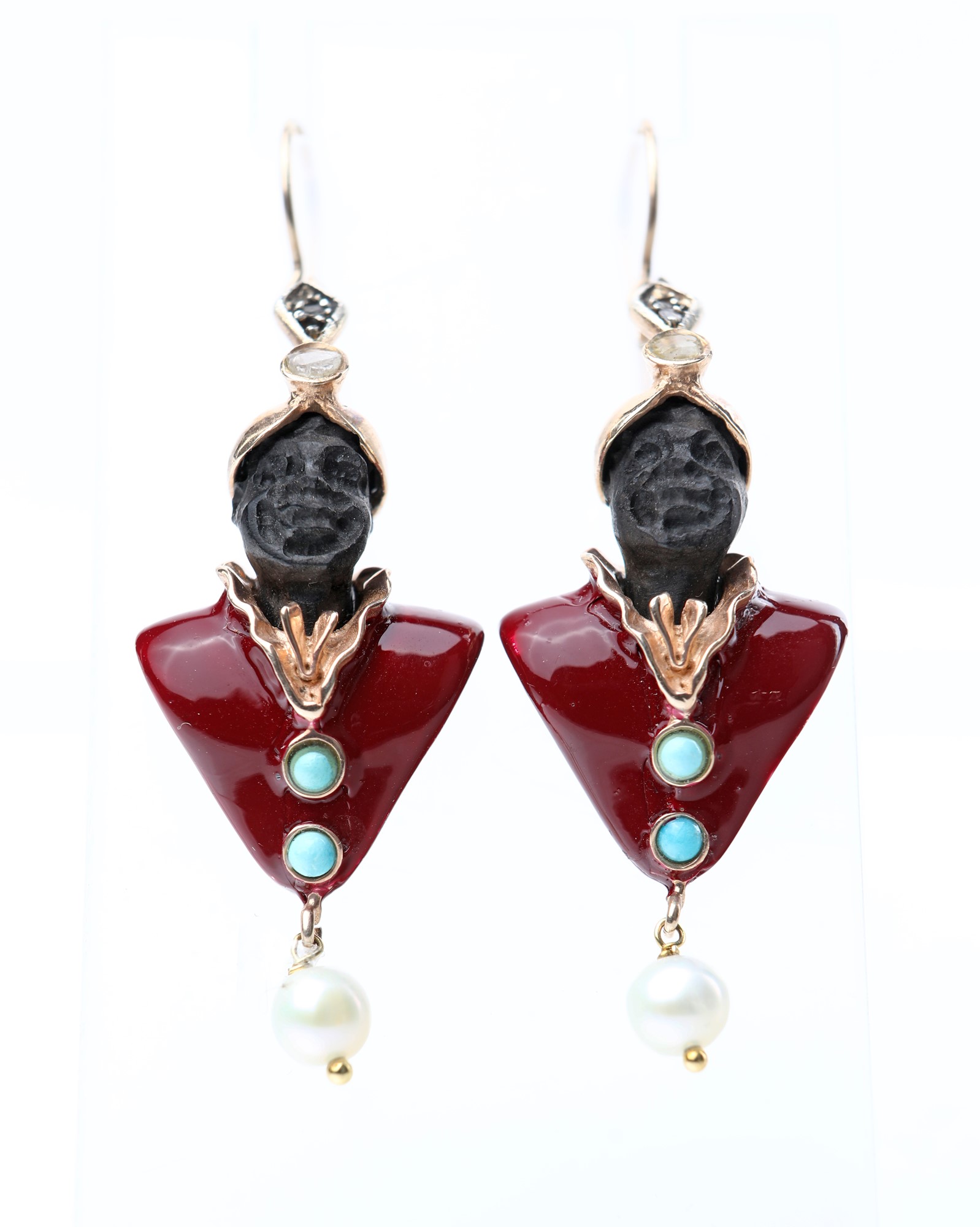 Coppia di orecchini, moretto in oro, argento, smalto, turchese e perla. Altezza cm 4
