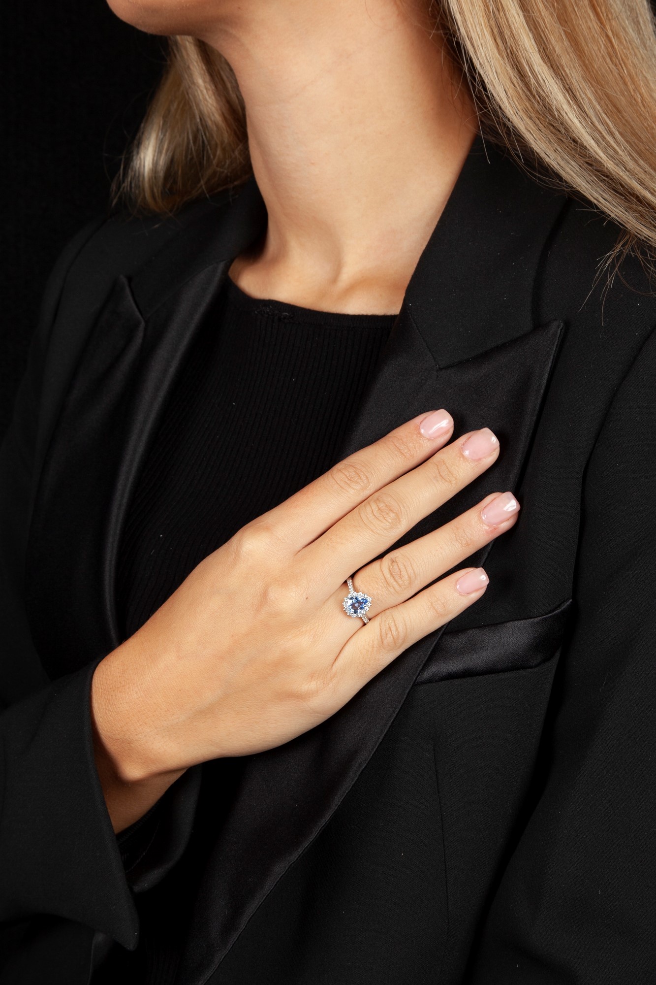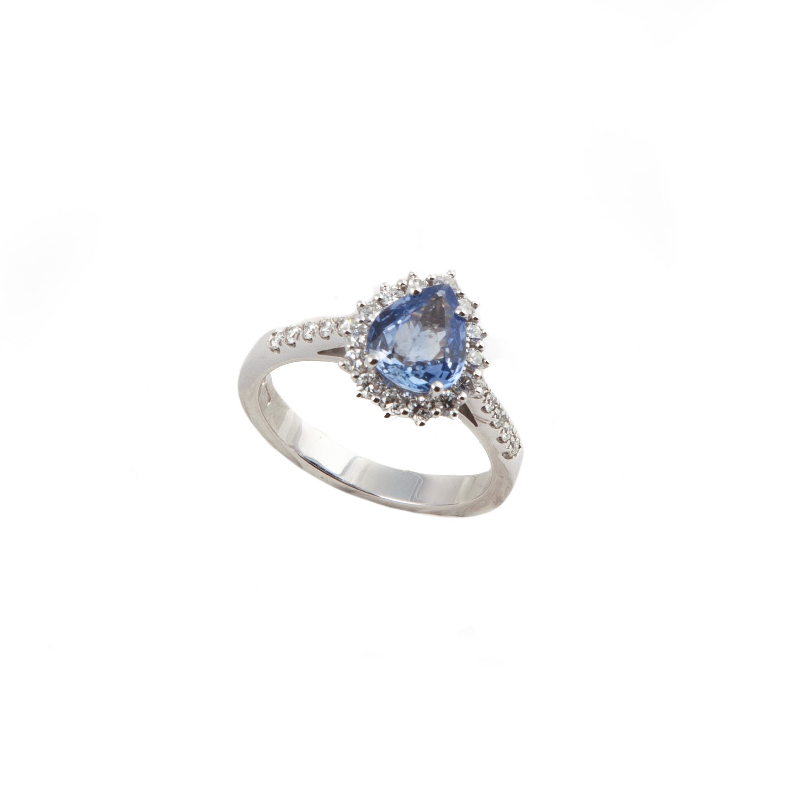 Oro bianco 750/000. Zaffiro Ceylon taglio a goccia ct. 1,60 circa, diamanti ct 0,50 circa F/G VVS VS. Peso complessivo gr. 4,70.