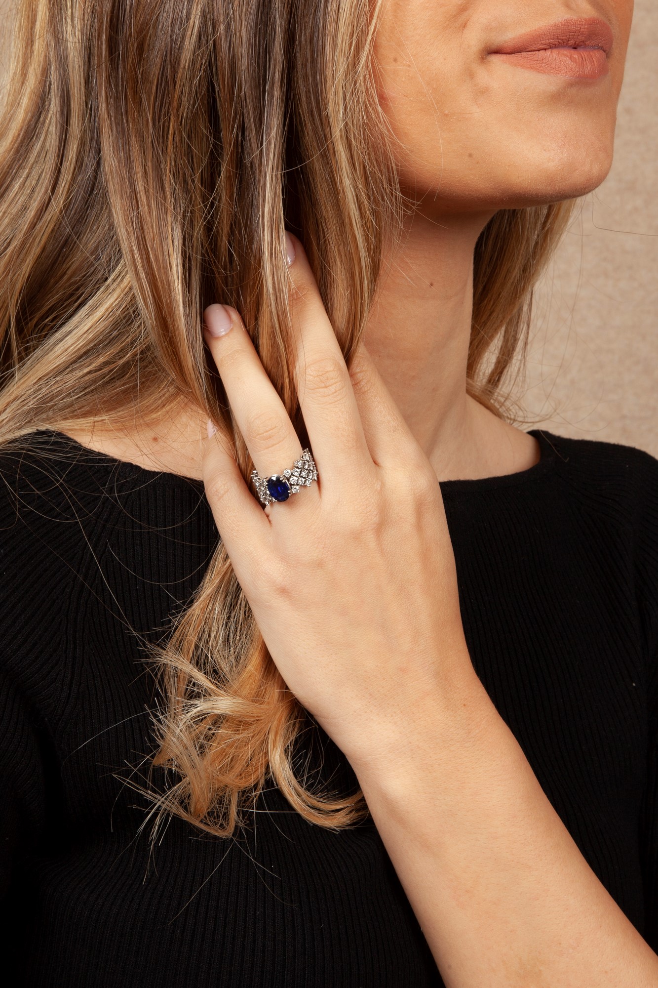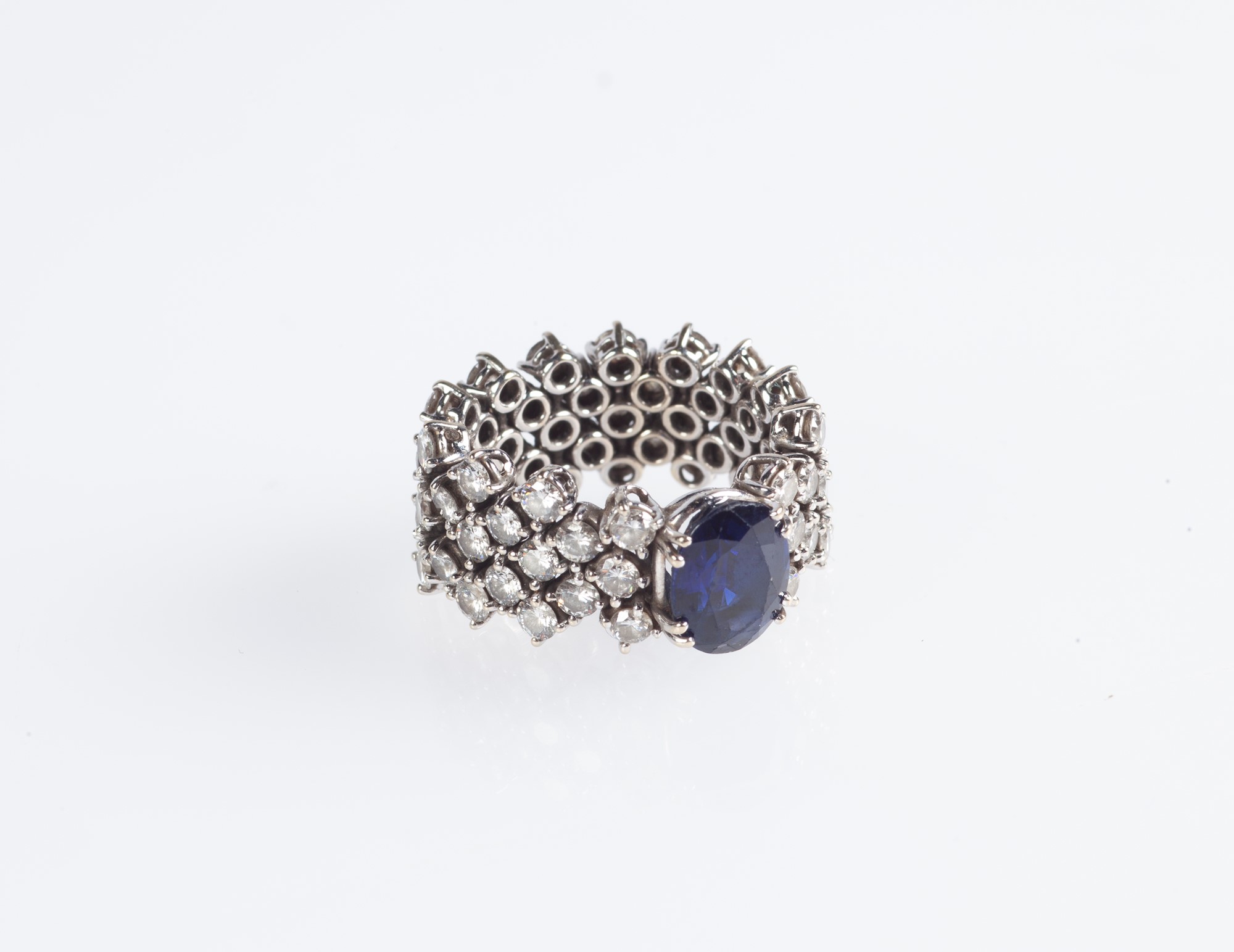 Oro bianco 750/000. Diamanti taglio rotondo brillante G-H VVS, VS. ct. 2,40. Zaffiro taglio ovale ct 2 ca. Peso complessivo gr. 8,50