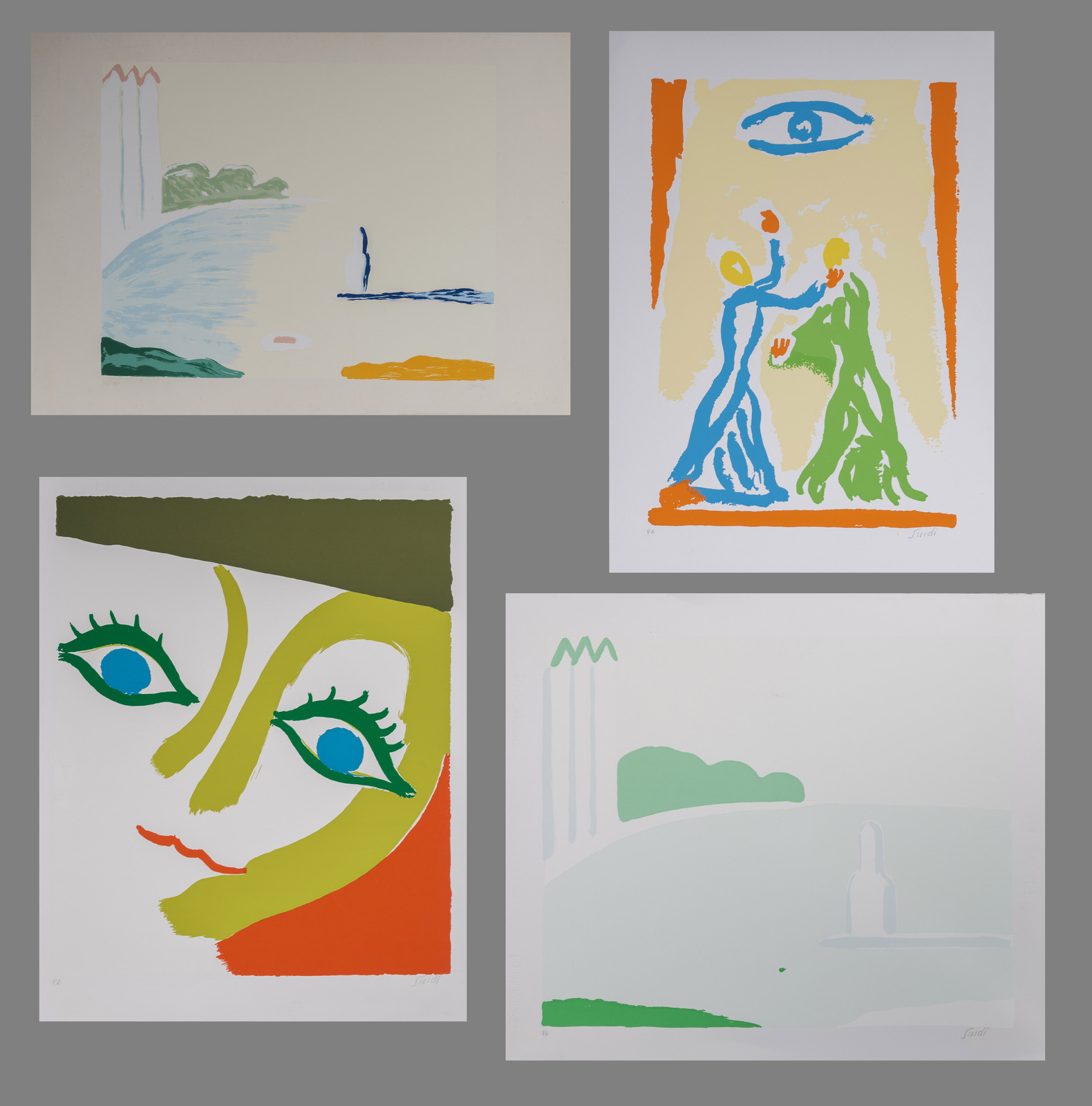 GUIDI VIRGILIO (1891 - 1984) Lotto composto da n. 4 fogli. . Serigrafia. Cm 70,00 x 50,00. 1. Venezia, Punta della Dogana. 90/100. Tiratura e firma in basso a matita. Al retro timbro Galleria il Traghetto, Venezia. Carta Arches. 50x70 cm. Difetti.