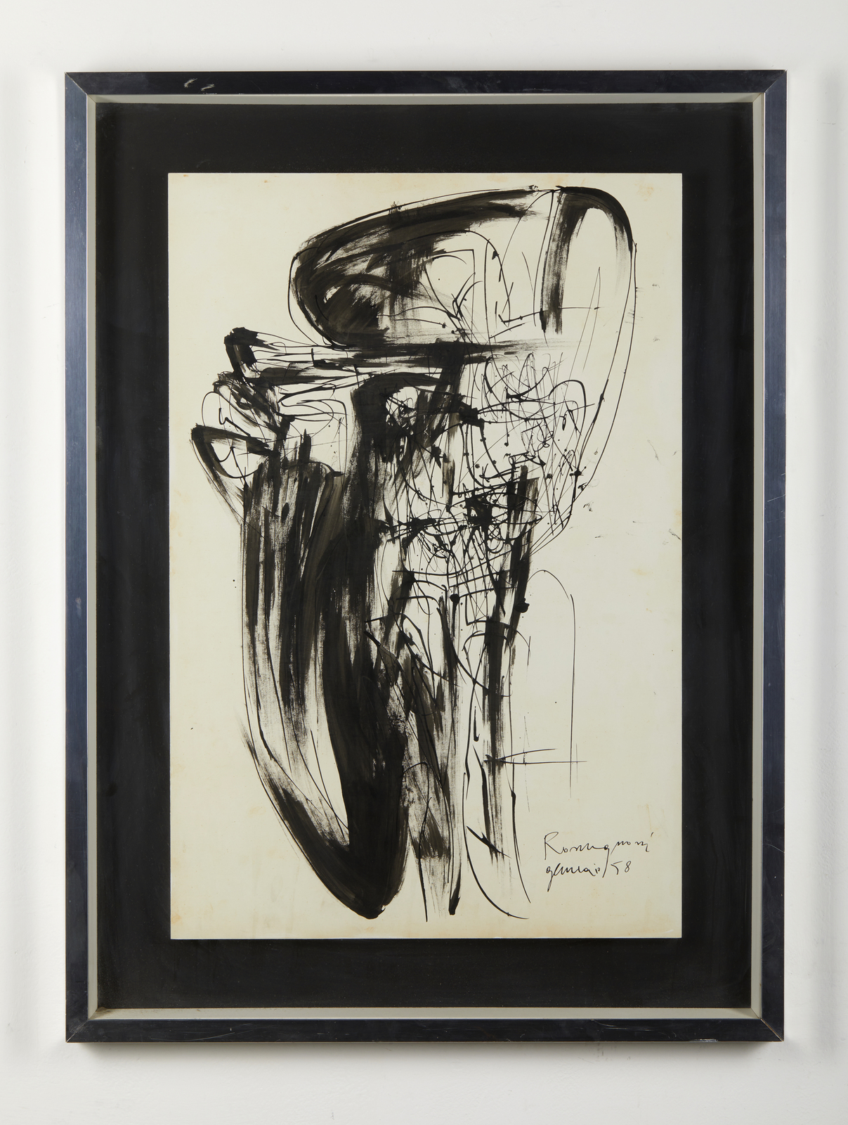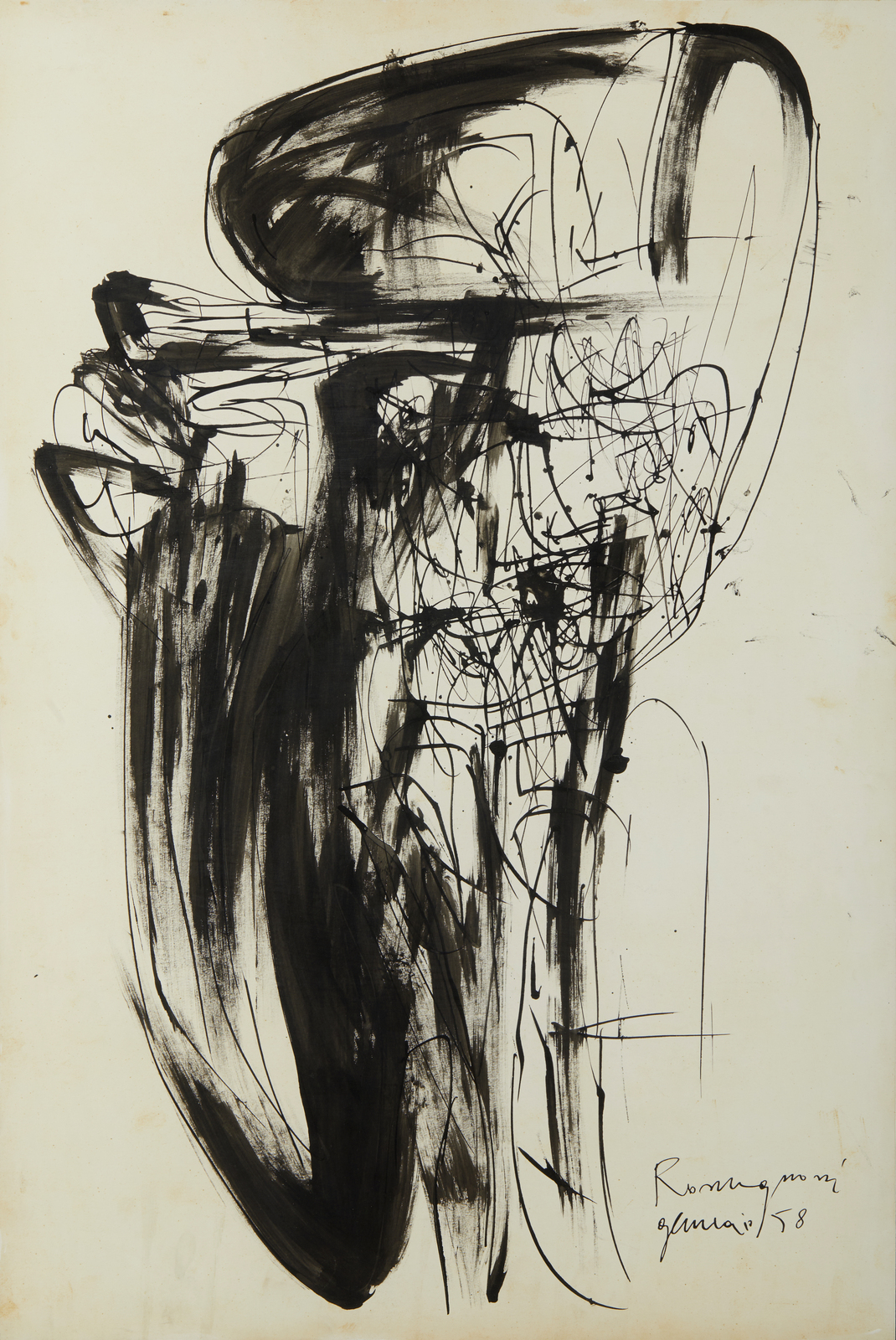 ROMAGNONI BEPI (1930 - 1964) Senza titolo. 1958. Inchiostro su carta. Cm 46,00 x 68,00. Firma e anno in basso a destra. Cornice presente