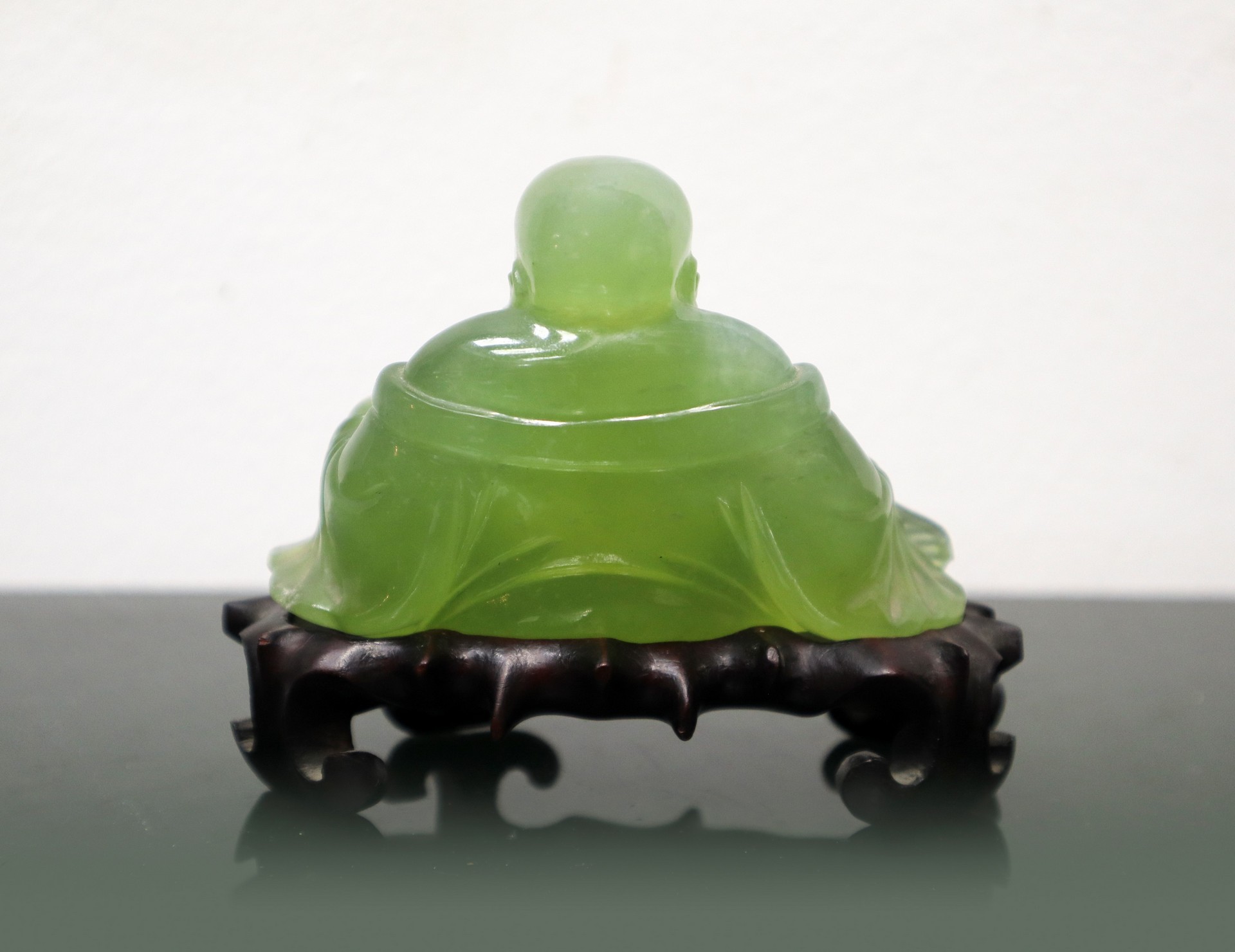 Buddha in giada H con base 10 cm, senza base h 8 cm, larghezza 10 cm, profondità 5 Piccole rotture e mancanze. Peso 282g