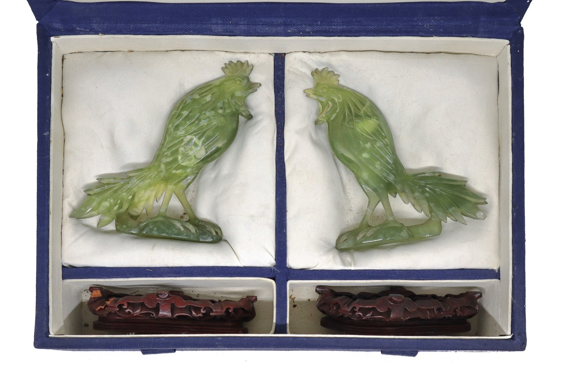 Sculture in giada verde raffiguranti galline