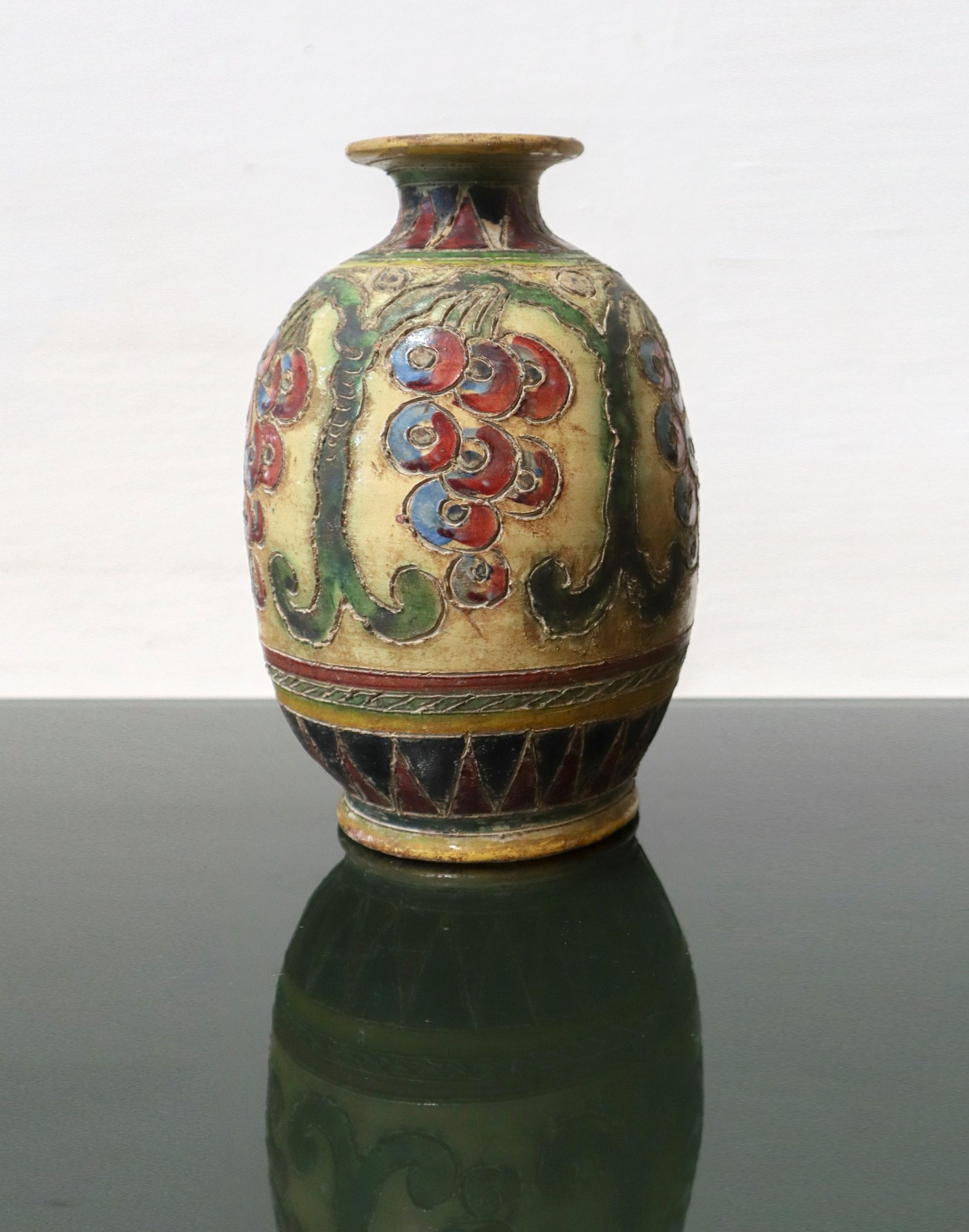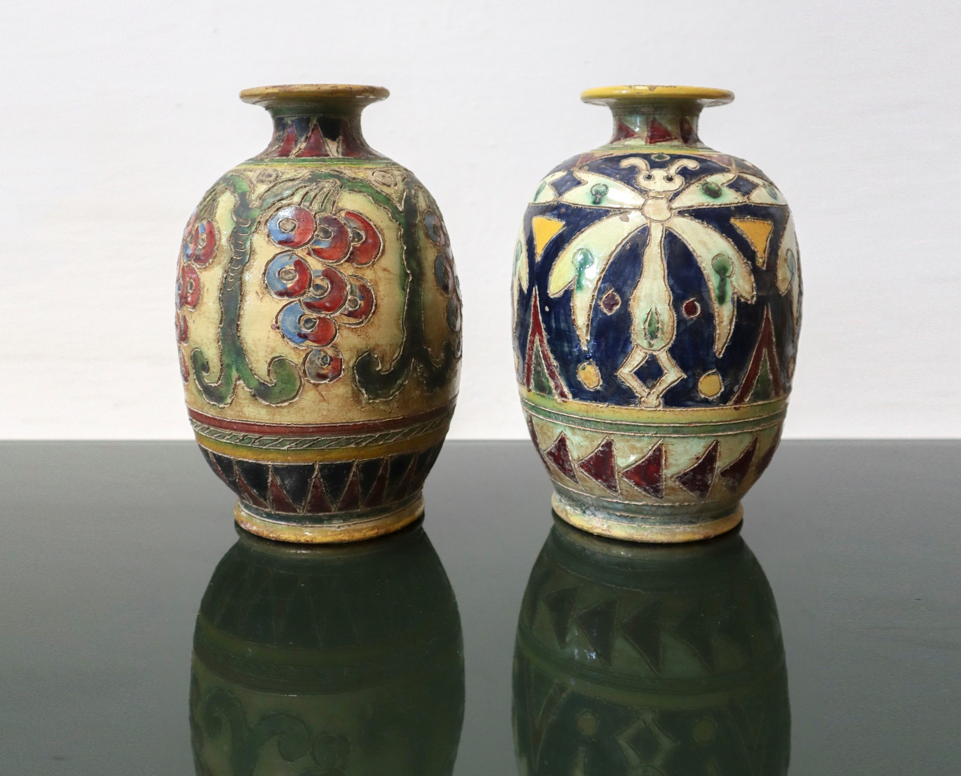 Antica coppia di vasi in maiolica, Morocco, 20° secolo cm 19 Con decorazioni di farfalle e frutta. Ideogramma Indi significante acqua sul fondo e numerati 1017.