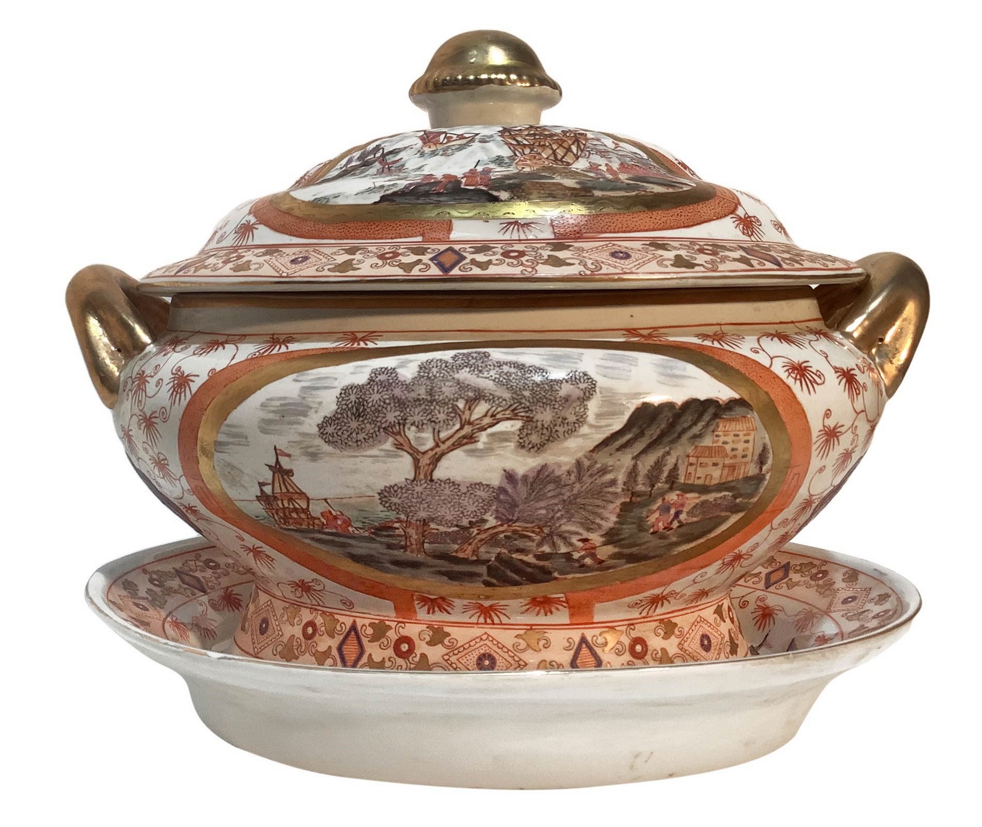 Zuppiera in porcellana cinese con piatto da portata, Inizi 20° secolo H 30 cm, larghezza 38 cm Decorazione di paesaggi entro riserve a medaglione sia sul fronte che sul retro, nel corpo e nel coperchio
