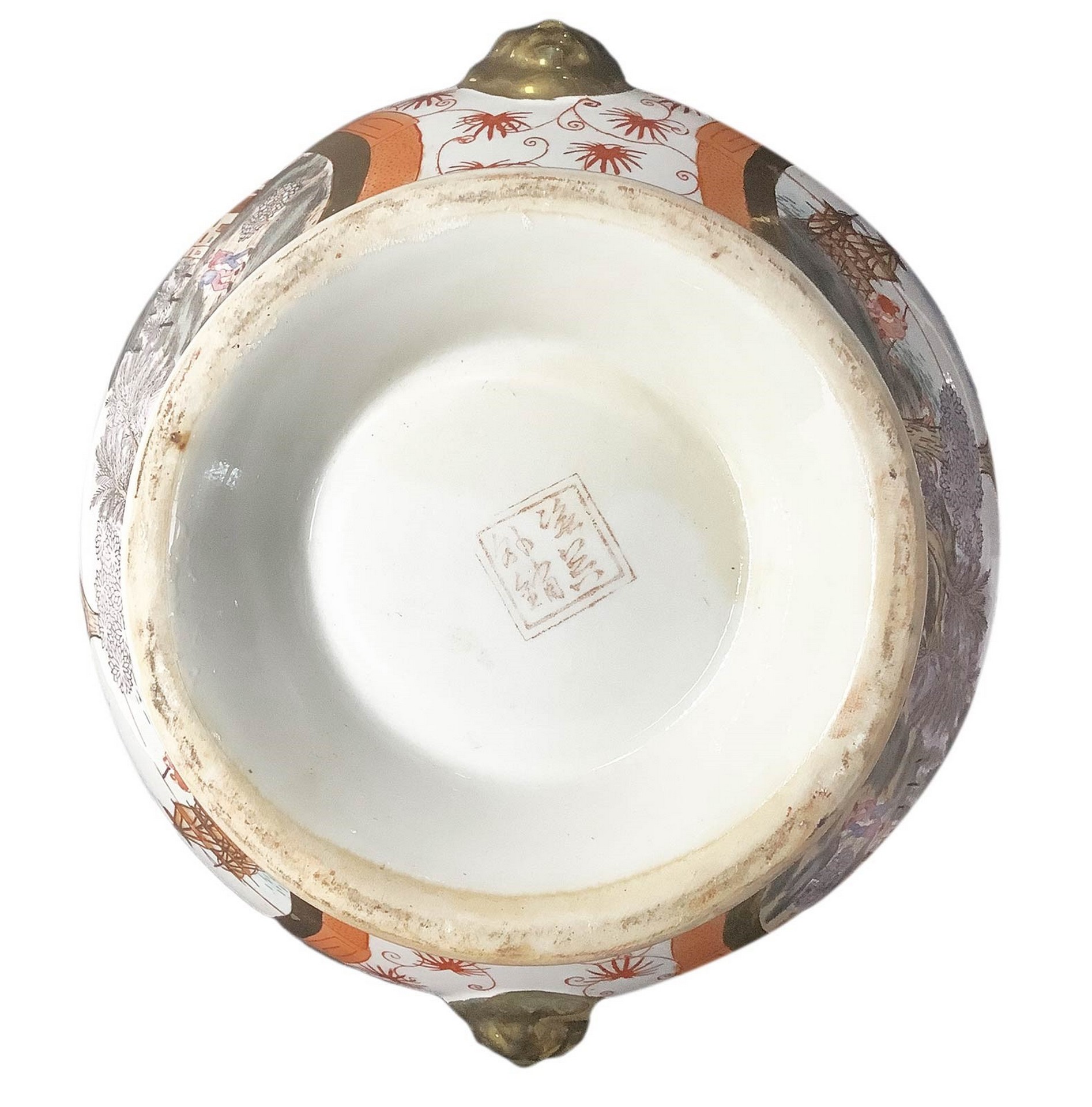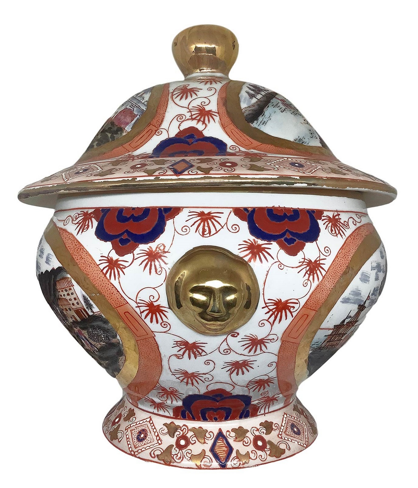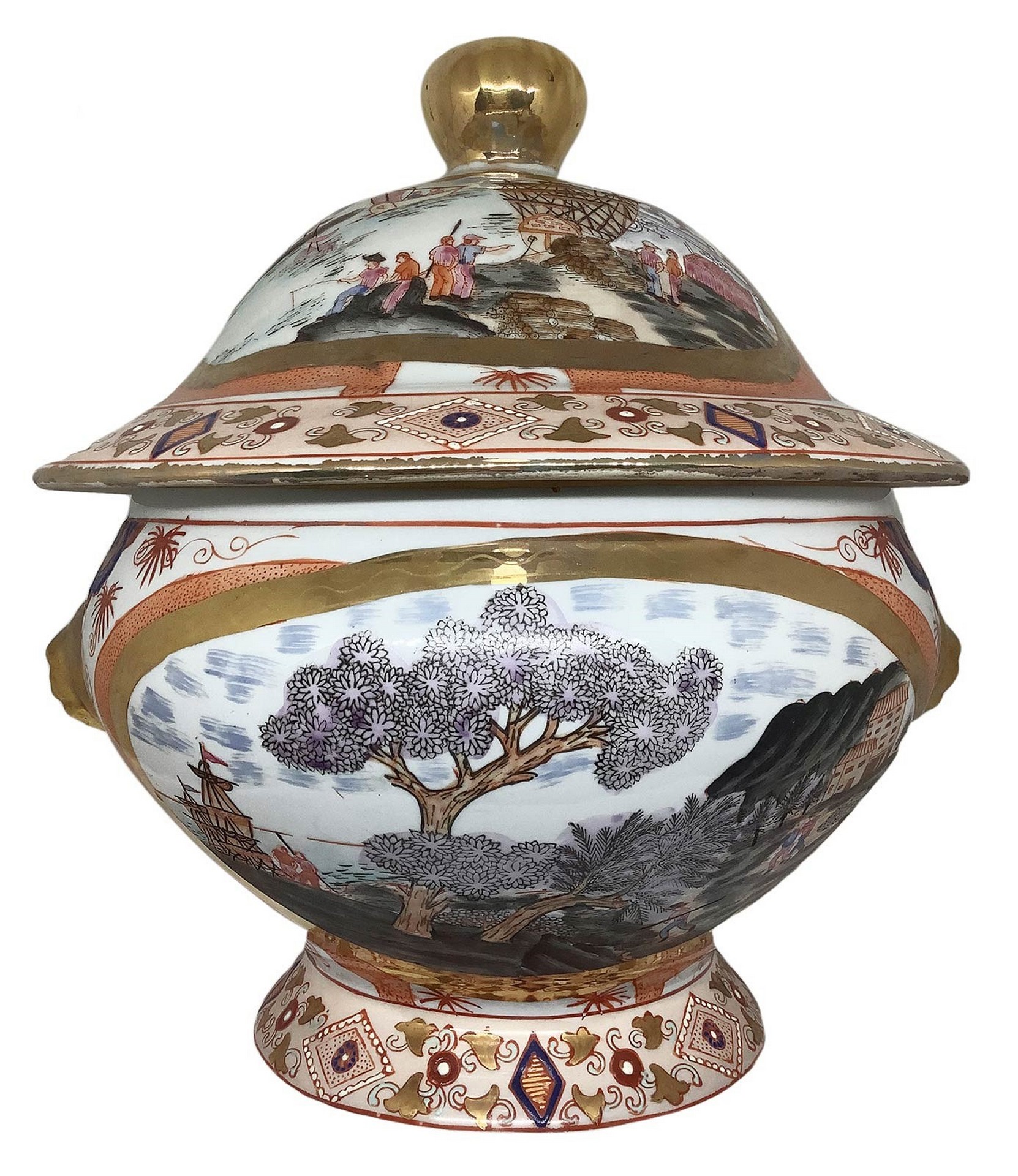 Piccola zuppiera in porcellana cinese, Inizi 20° secolo H 25 cm, base 13 cm Decorazione di paesaggi entro riserve a medaglione sia sul fronte che sul retro, nel corpo e nel coperchio. Richiami in oro a ormulo