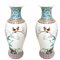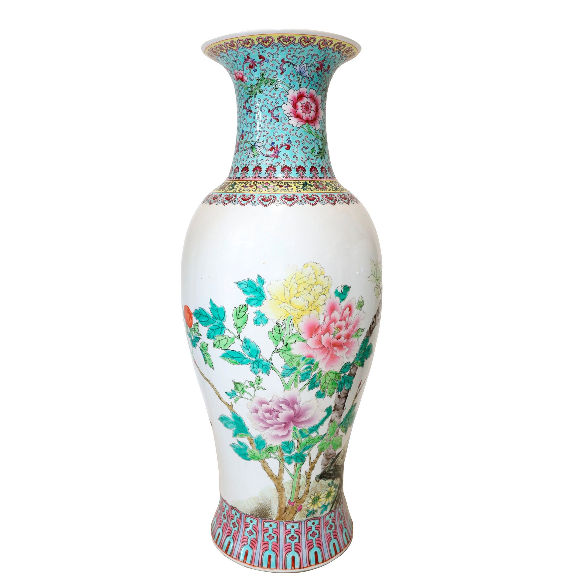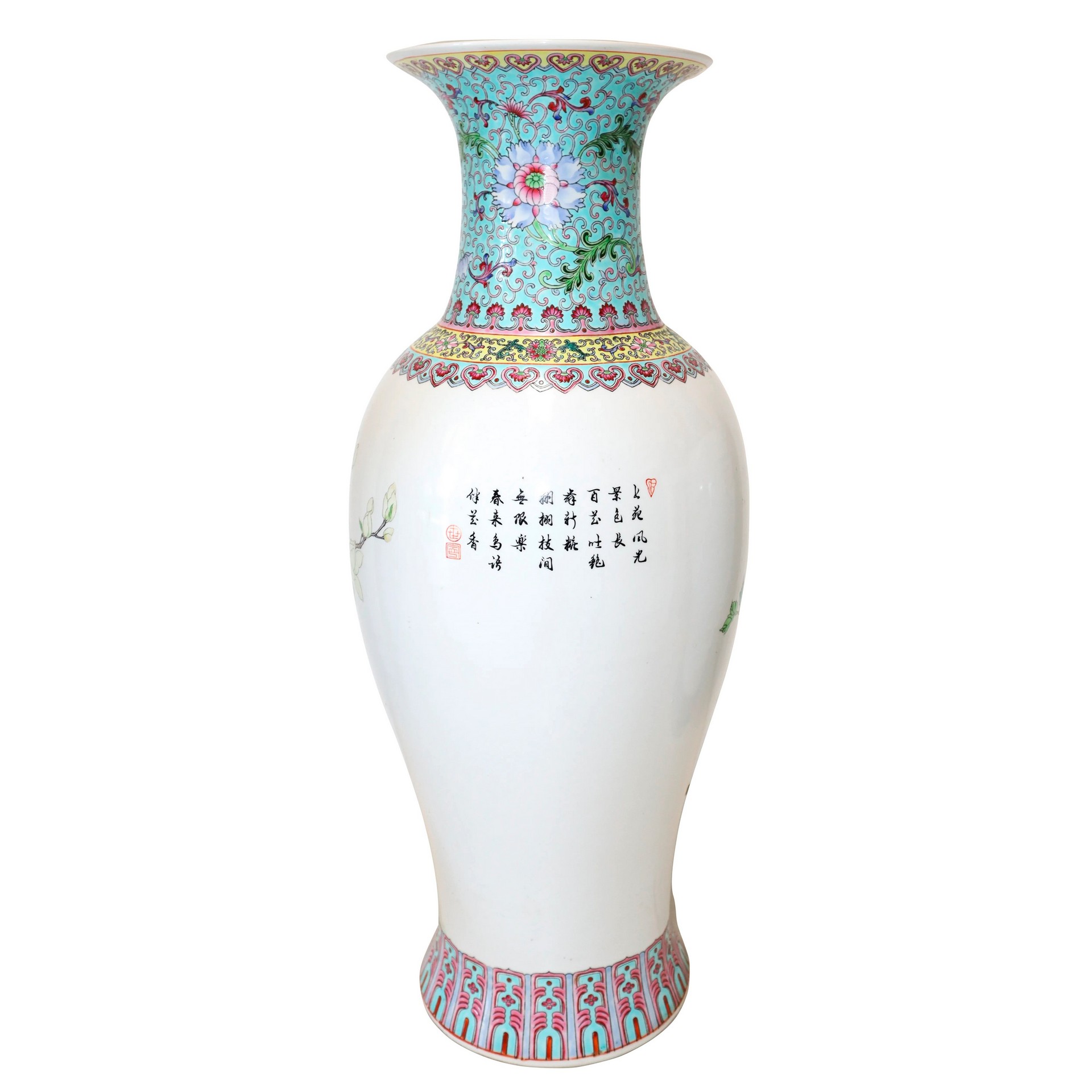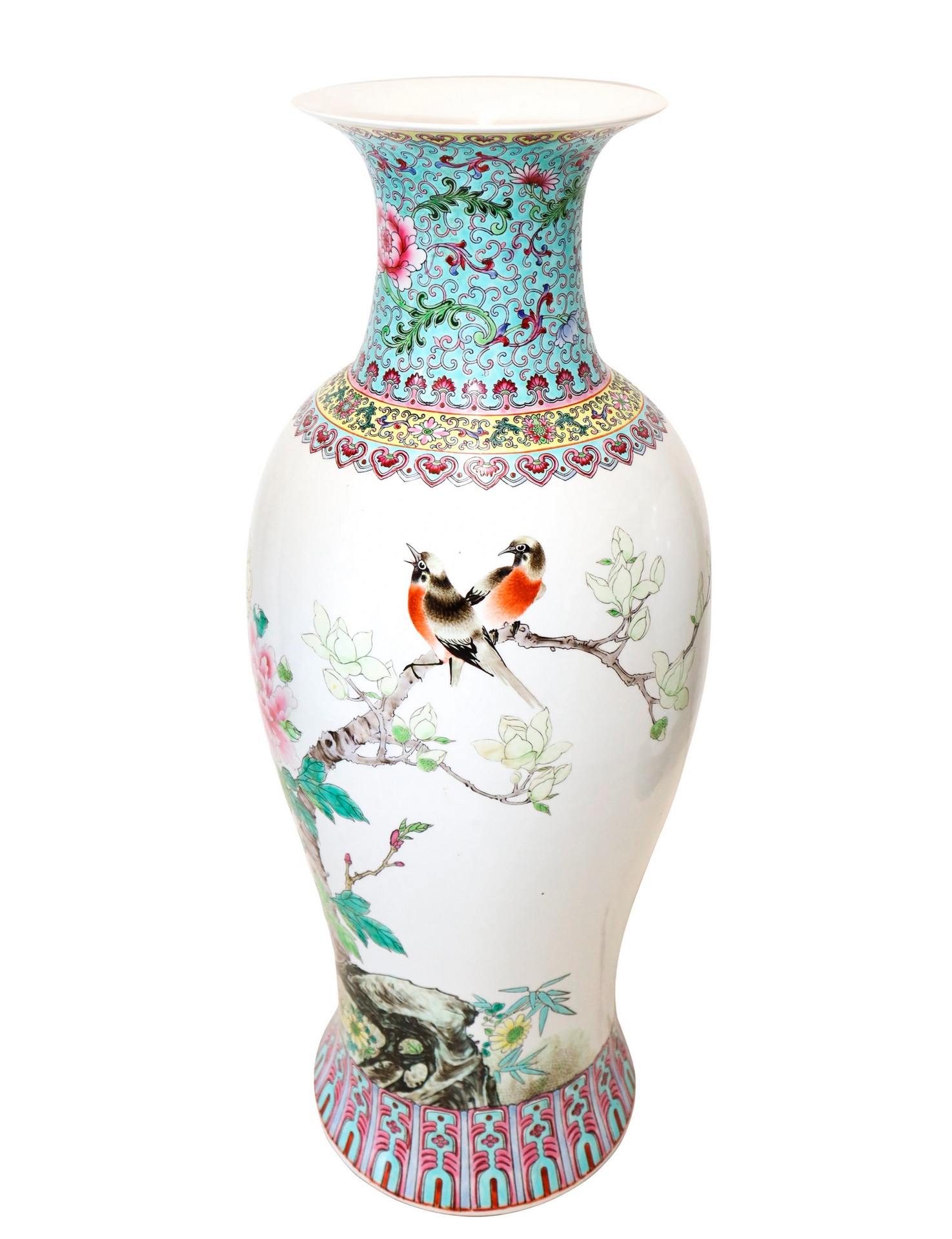 Coppia di grandi vasi cinesi H cm 62, bocca cm 20 Su base bianca con decorazioni floreali e di volatili.