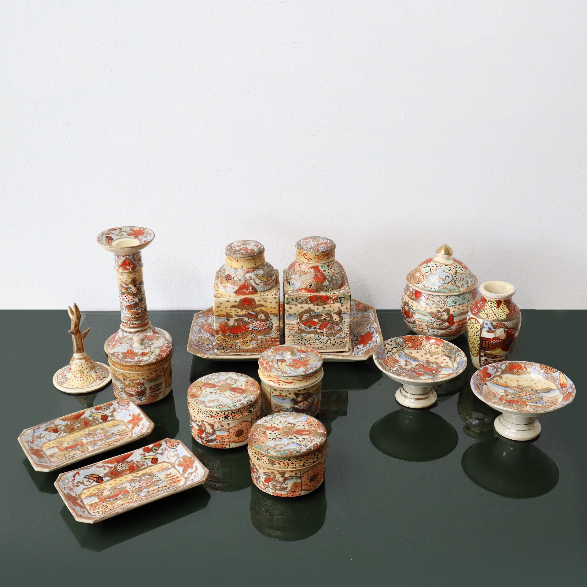 薩摩焼 Royal Satsuma - Set da cerimonia giapponese in porcellana, Fine 19° secolo Portacandela H cm 14, vasetti H min 5, max 11, vassoi min cm 12 x 8, max cm 21 x 14