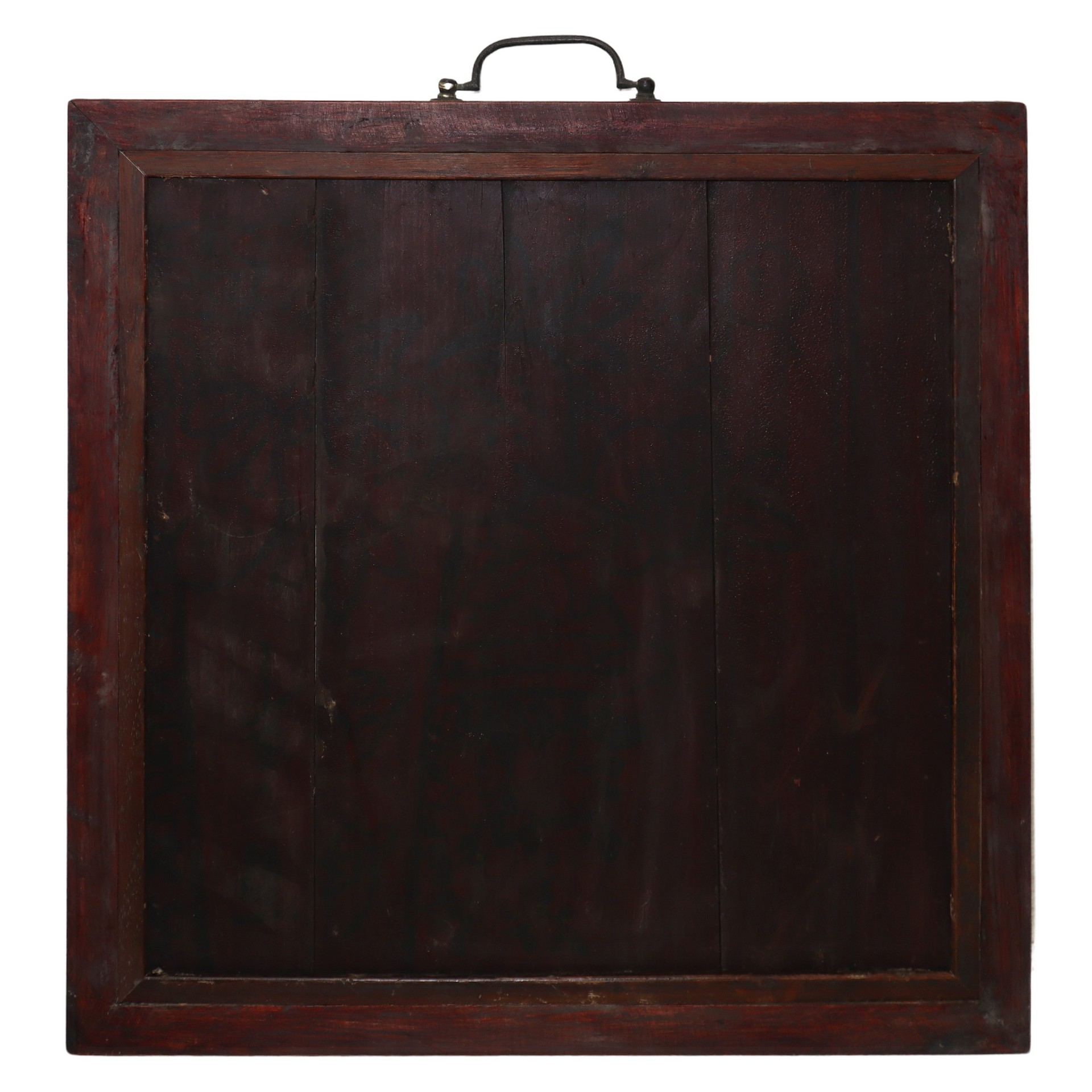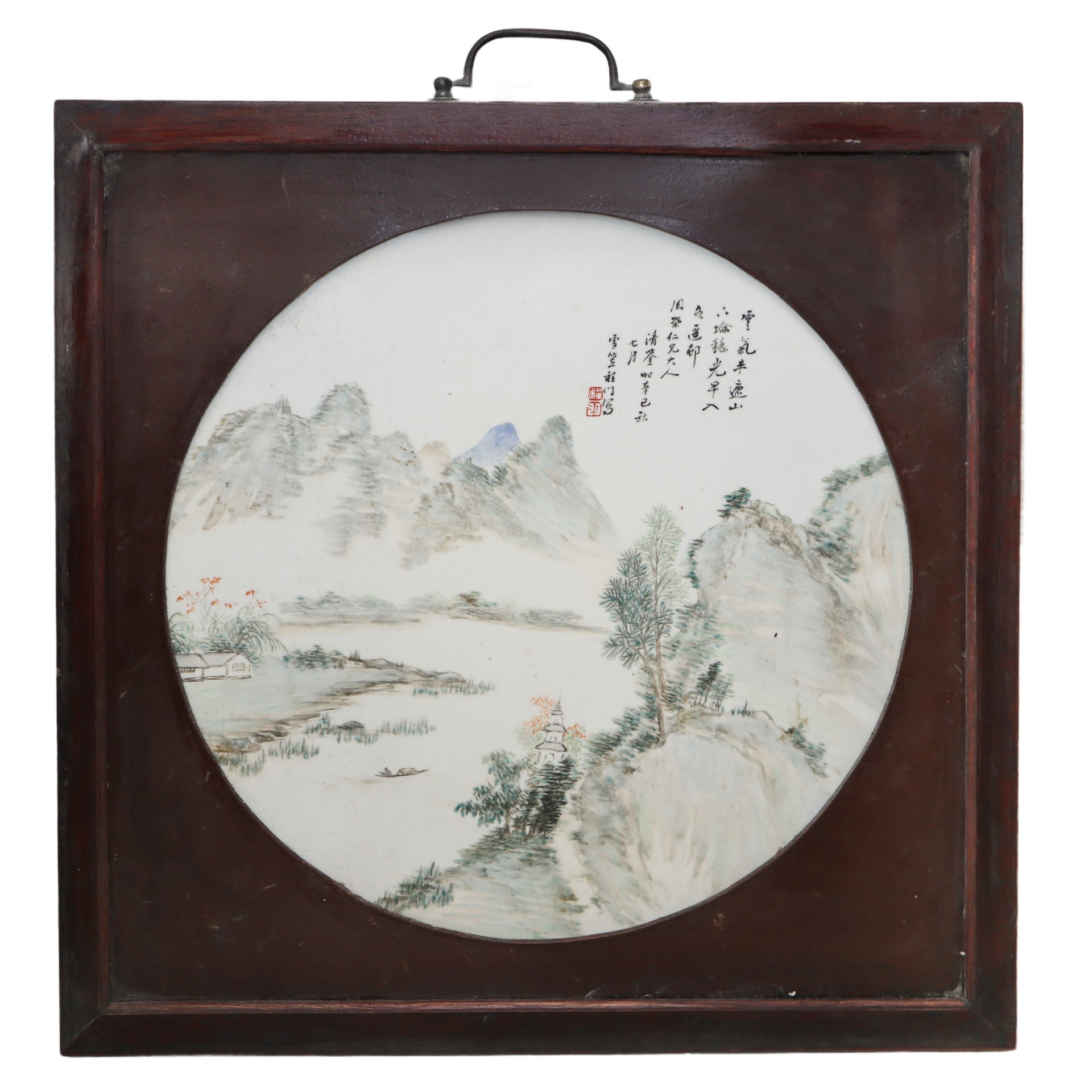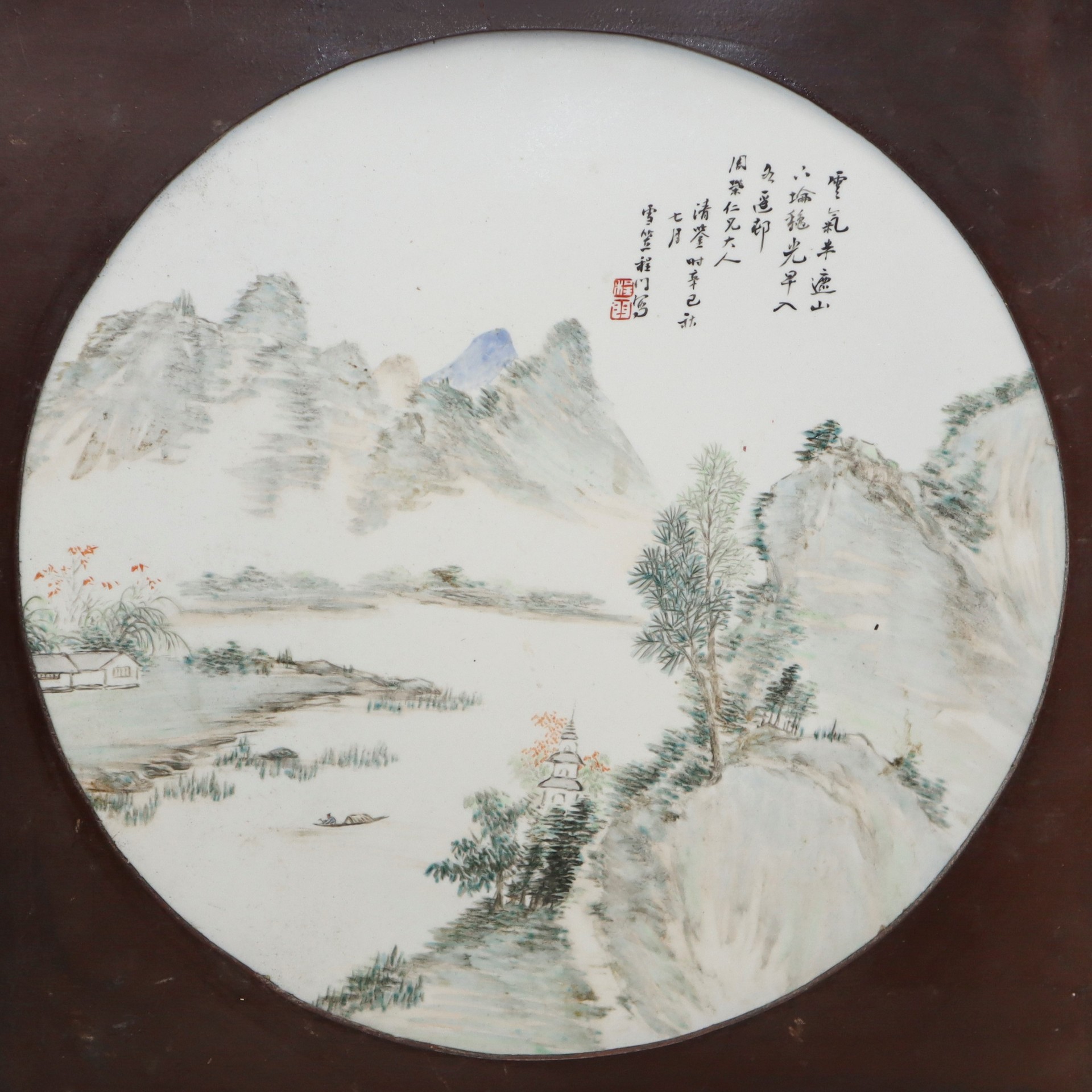 Qian Jiang Porcelain - Piatto con paesaggio fluviale, Fine 19° secolo Diametro 32, in cornice cm 41,5 x 41,5 Porcellana dipinta Firmato da celebrità