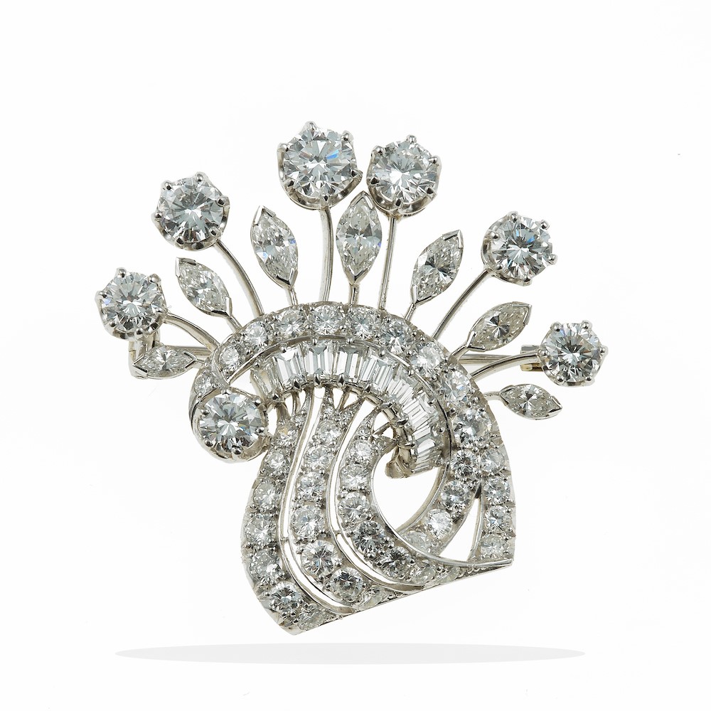 Lot 67 | Spilla con diamanti taglio rotondo navette e baguette