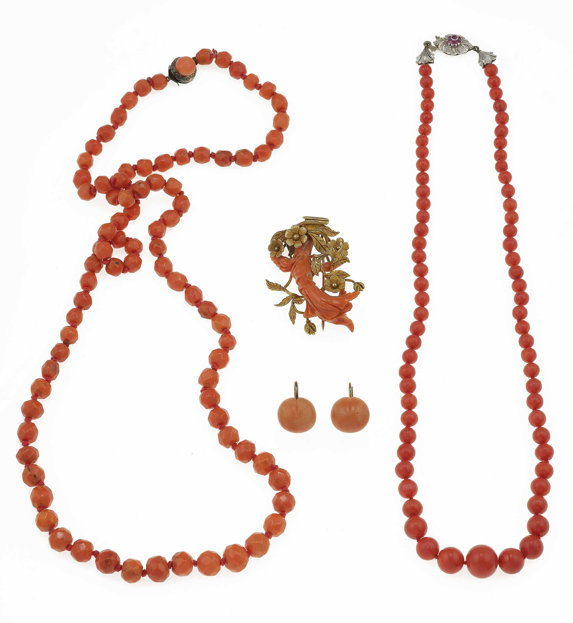 Lotto composto da due collane di corallo, una spilla ed un paio di orecchini
