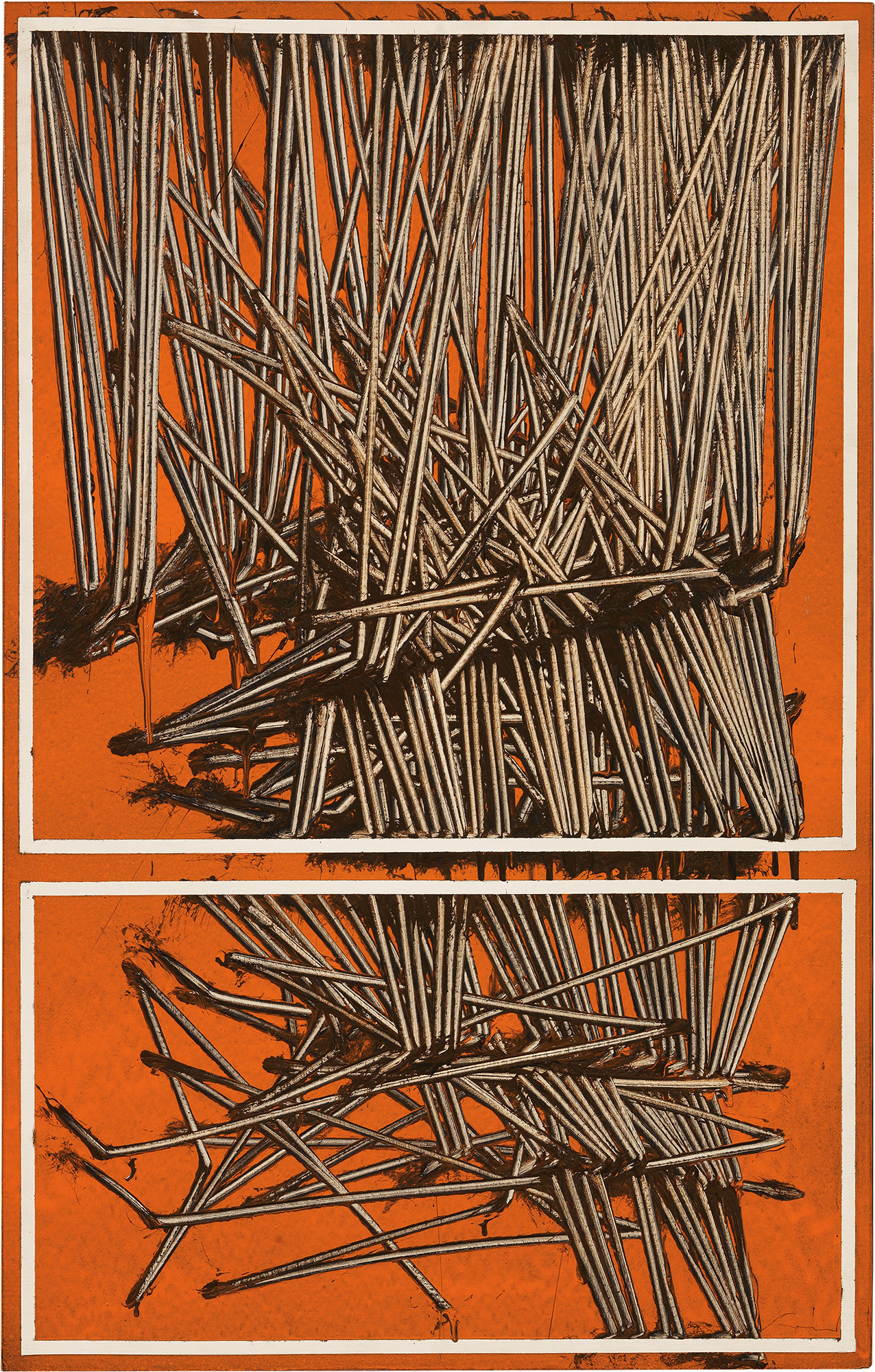 Firma in basso a destra: Scanavino; firma, titolo e data al verso sulla tavola: Scanavino / Doppia tramatura / 1975.