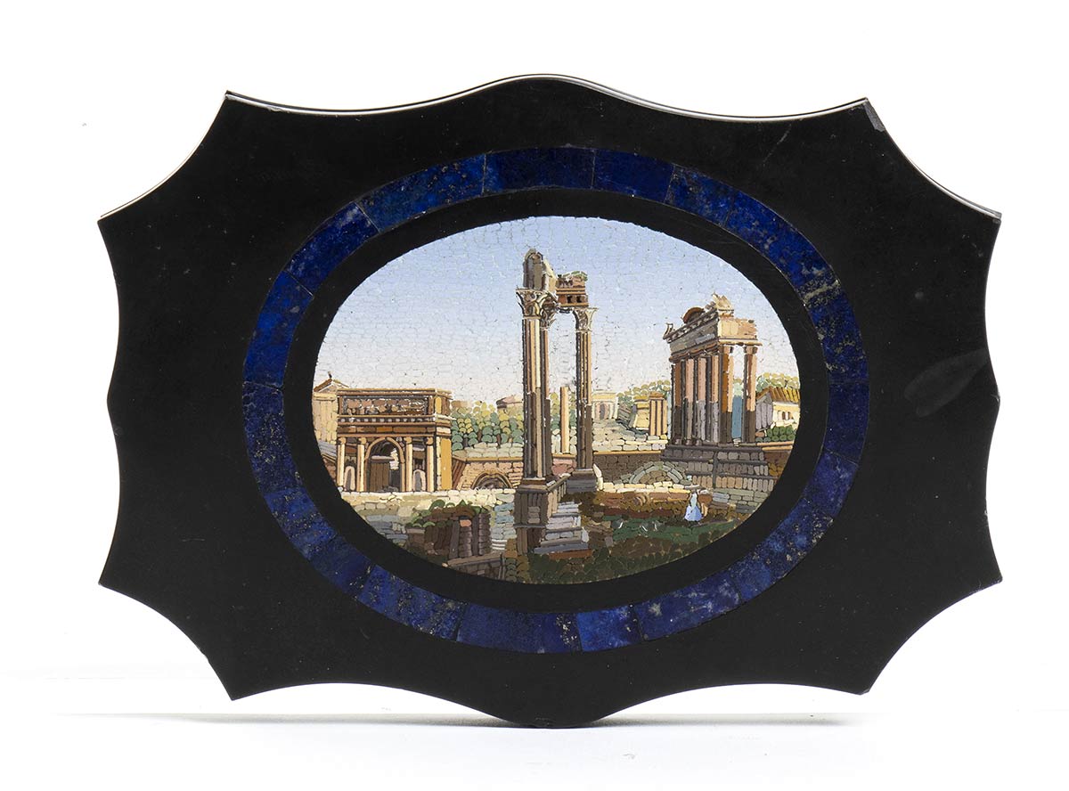 in marmo nero del Belgio con conice in lapislazzuli, micromosaico raffigurante una veduta del Foro romano con l’arco di Settimio Severo, le tre colonne superstiti del Tempio di Vespasiano ed il Tempio di Saturno.