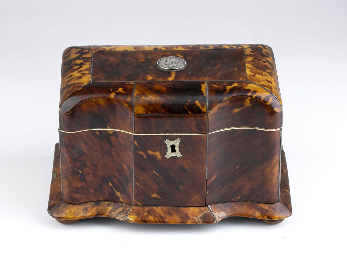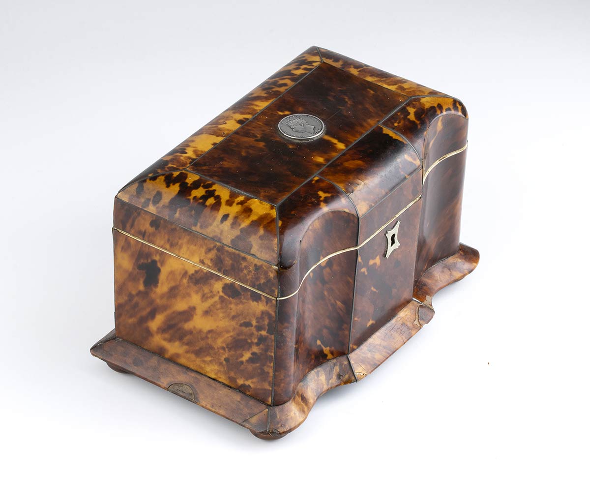 di forma rettangolare sagomata realizzata interamente in tartaruga (hawksbill sea turtle, Eretmochelys imbricata, Cheloniidae). Coperchio incernierato incastonato con una moneta in argento del 1826 raffigurante Re Giorgio IV.