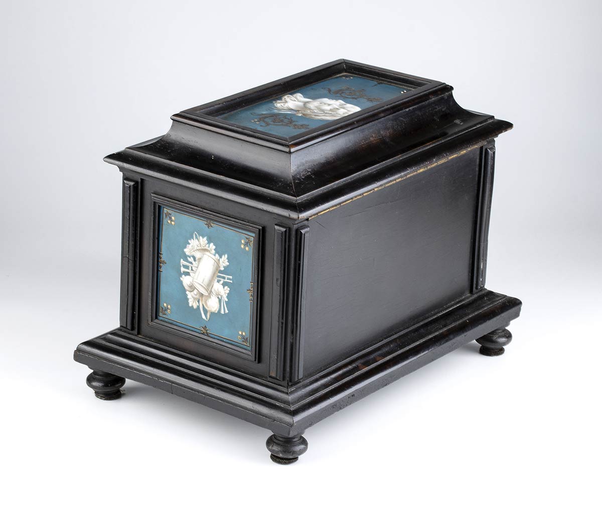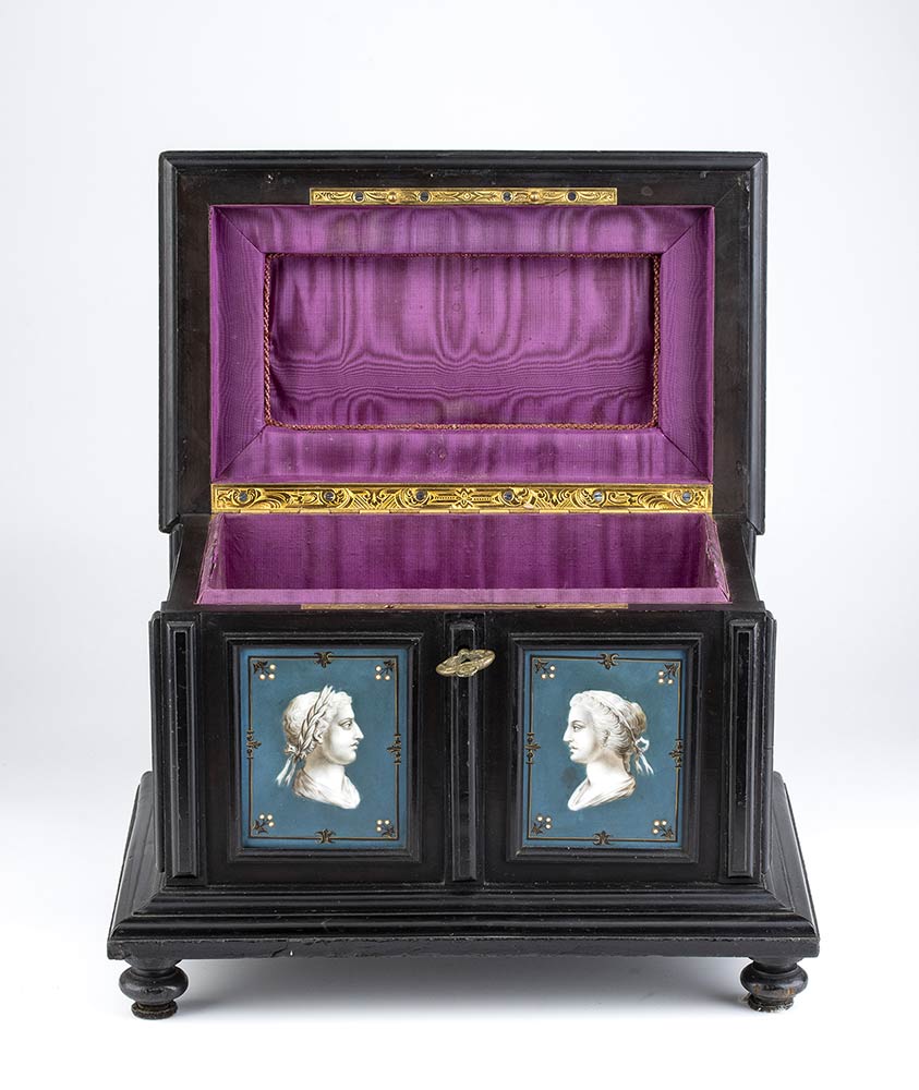 di forma rettangolare con coperchio incernierato, in legno ebanizzato con riserve in smalto. Firmato "A Klein a Paris".