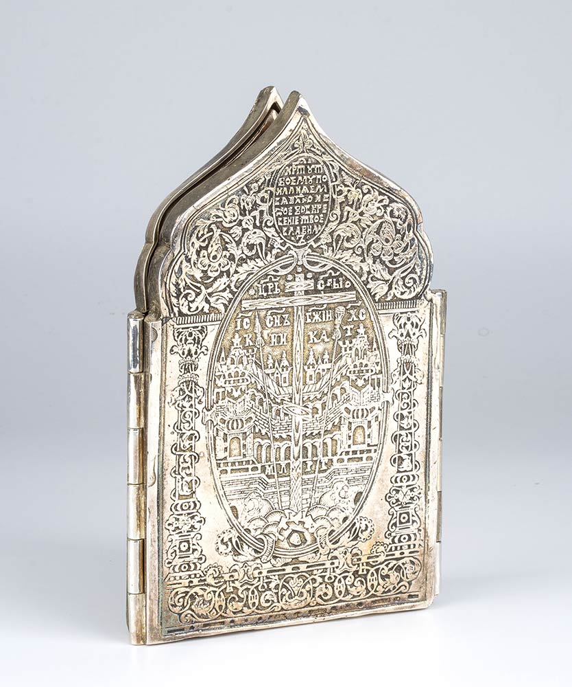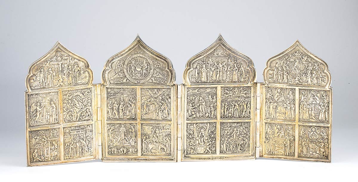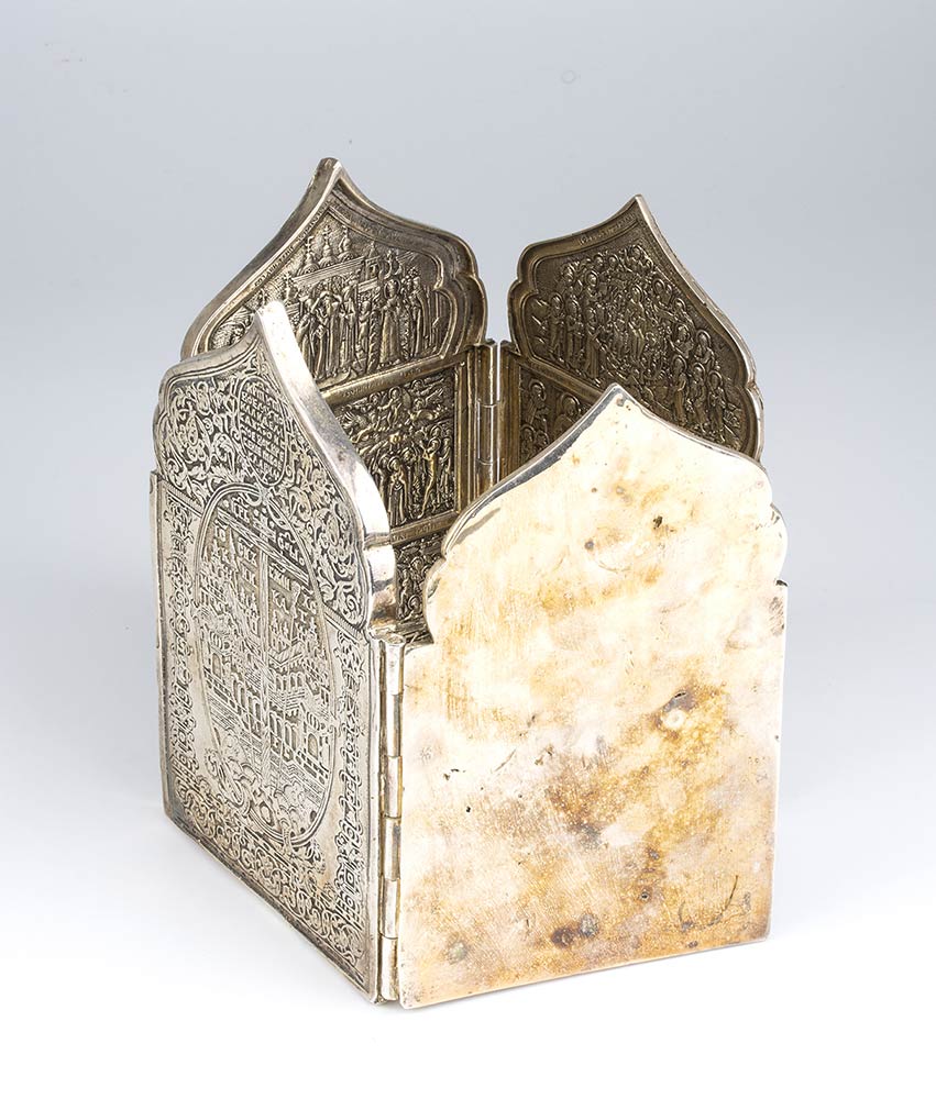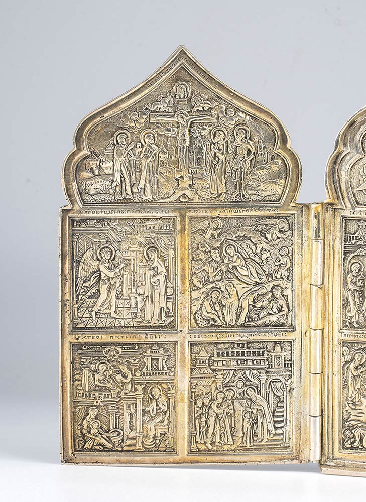 in ottone con cerniere a tre ante, narrazioni religiose e cornice semplice sagomata, raffigurante scene della vita di Cristo.