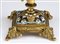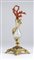 in bronzo dorato, base quadrata traforata e decorata con smalti policromi poggiante su quattro piedini fogliati sulla quale si innesta il contenitore in vetro molato sul quale è avviluppato un serpente; sulla sommità un ramo di corallo mediterraneo (corallium rubrum).