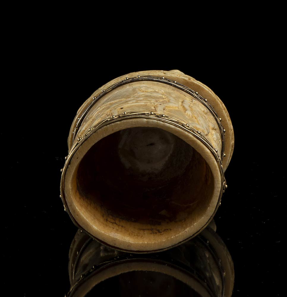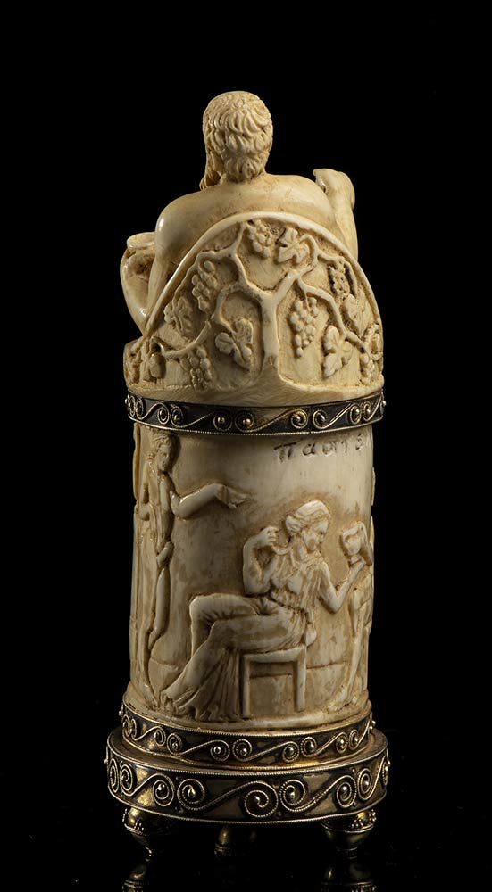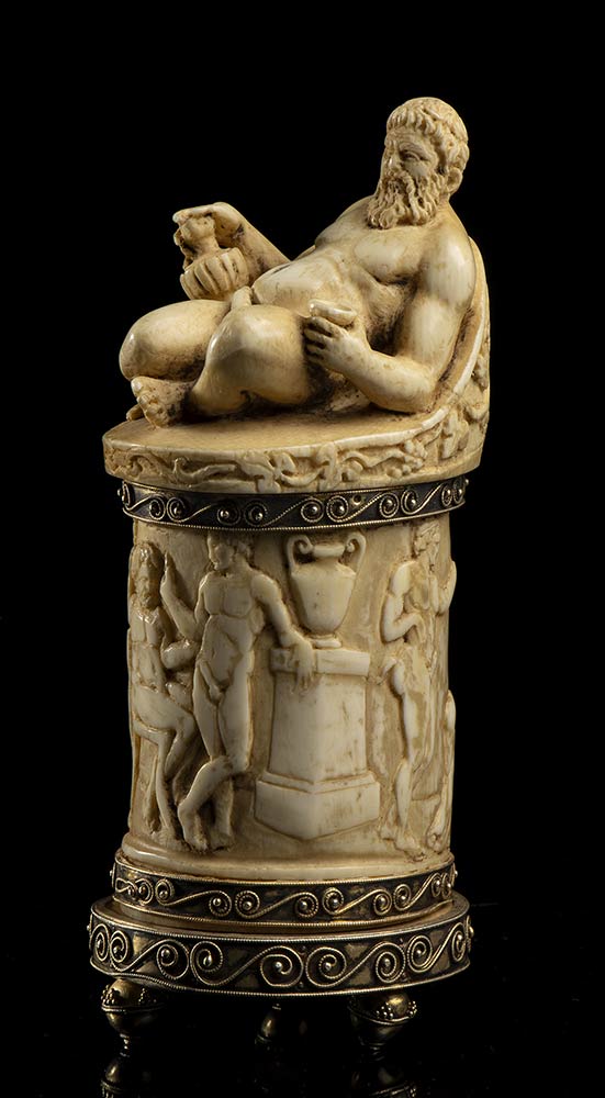realizzato in avorio di elefante (Loxodonta africana Blumenbach, 1797 o Elephas maximus Linnaeus, 1758) con piedini e applicazioni in argento dorato.