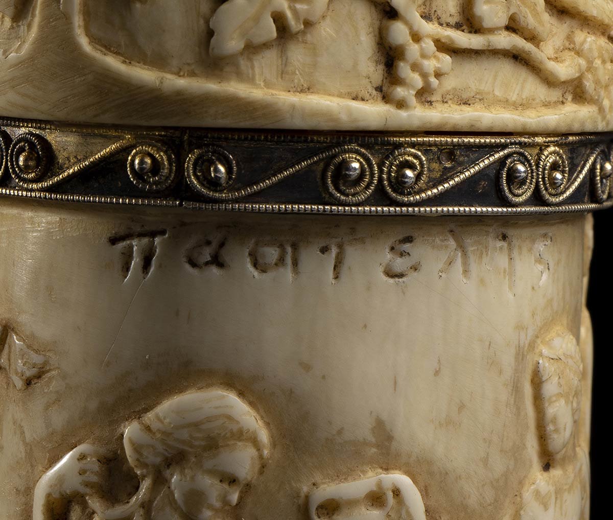 Il corpo interamente scolpito con scene conviviali reca incisa la scritta "Πασιτελης", verosimibilmente assimilabile allo scultore, toreuta e scrittore greco antico Pasitele (attivo nell'Italia meridionale nel I secolo a.C.).