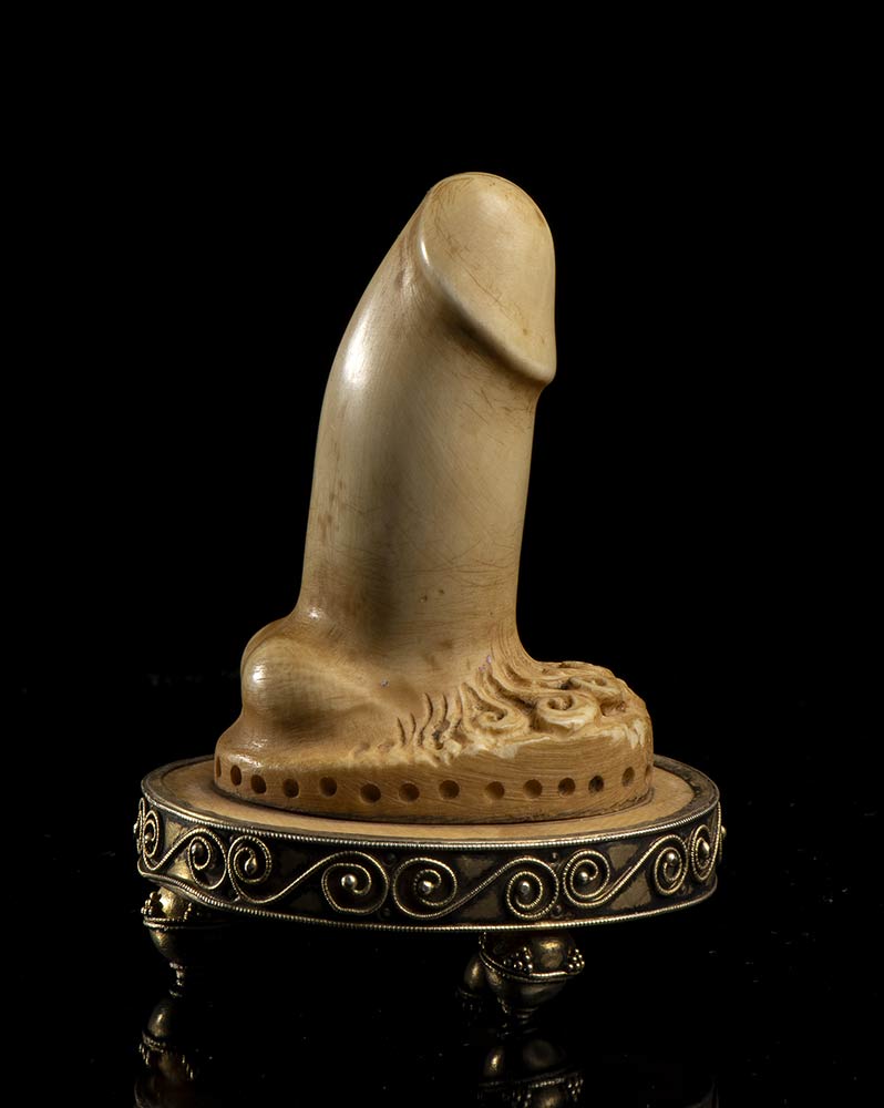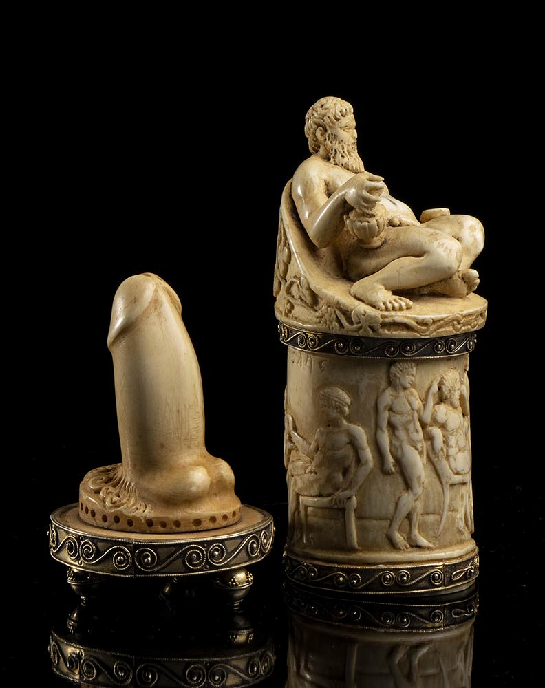 Il coperchio è cimato dalla rappresentazione di Priapo, antica divinità greca e romana usualmente rappresentata come un piccolo uomo barbuto dotato di un fallo enorme; Priapo era simbolo dell’istinto sessuale e della fecondità maschile ed era protettore della natura e custode di orti e giardini; sollevando il coperchio si cela un ulteriore rappresentazione fallica.