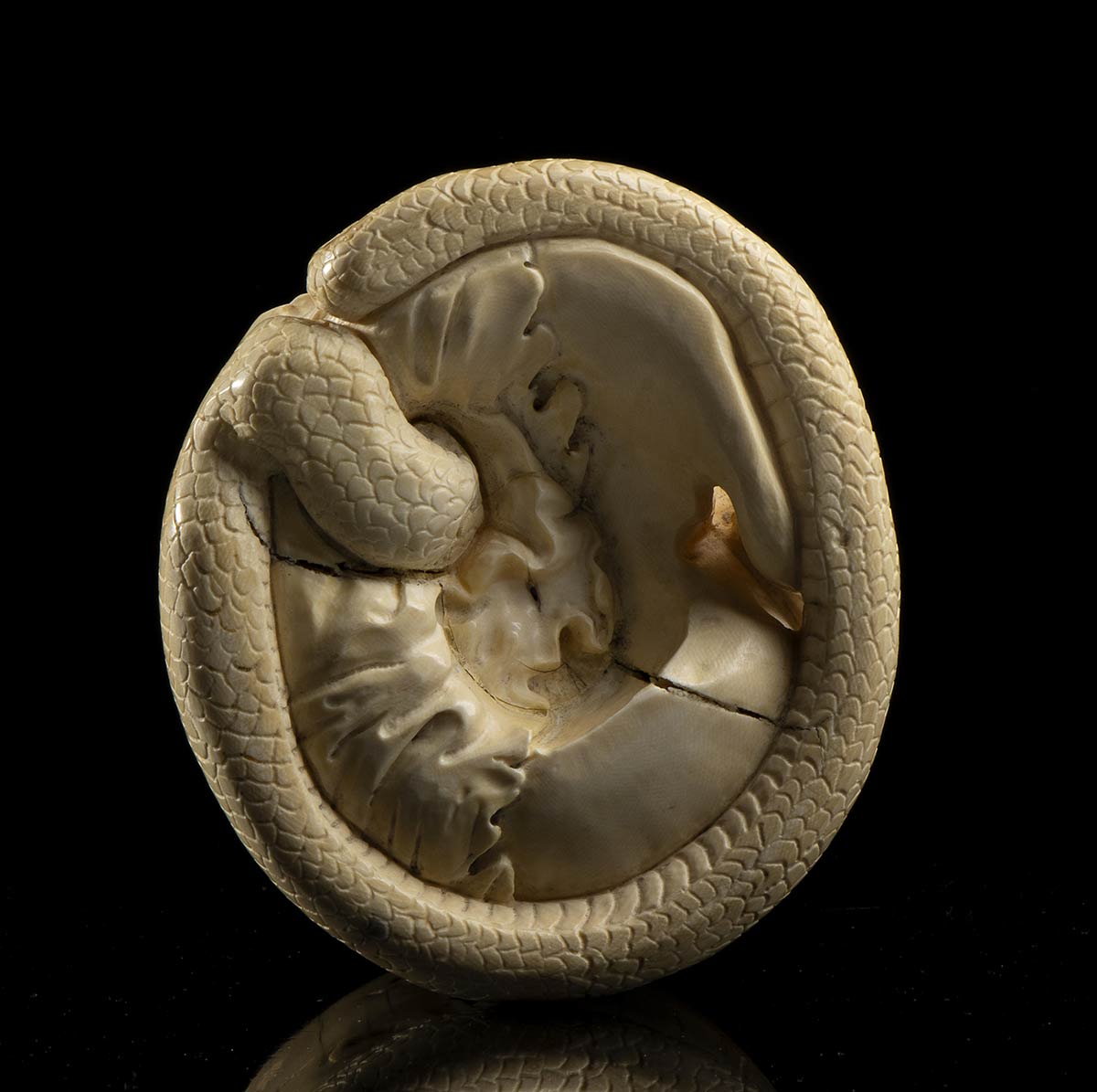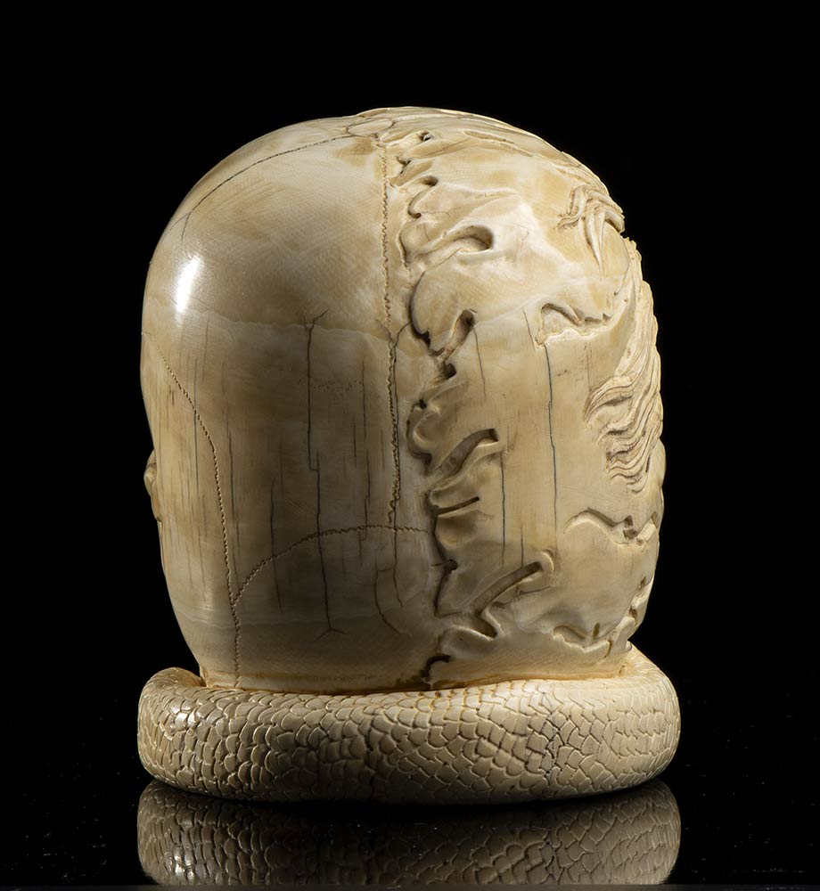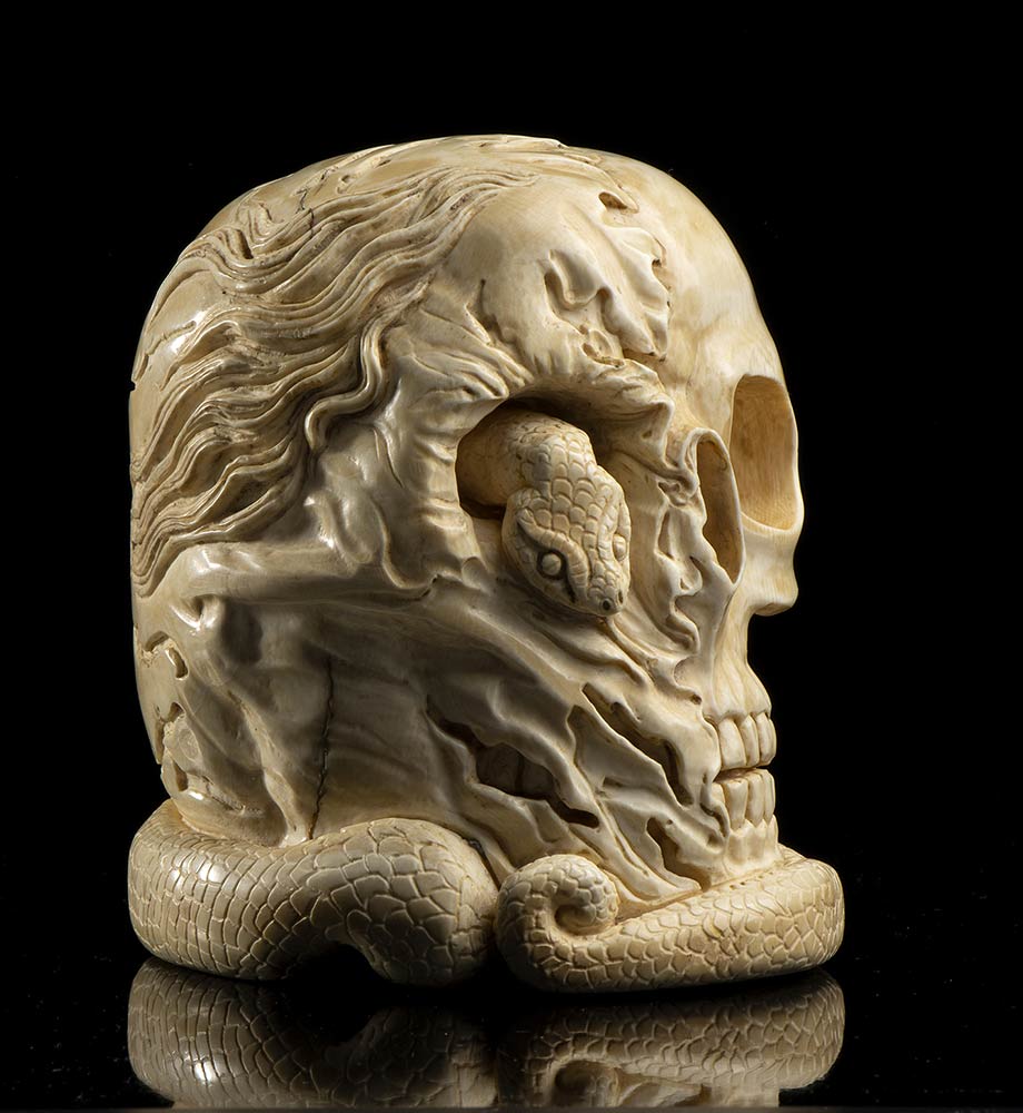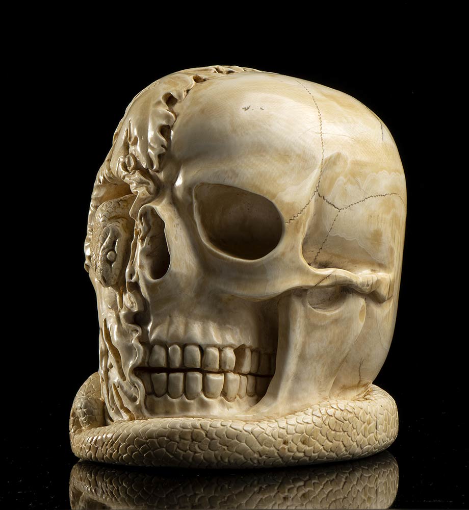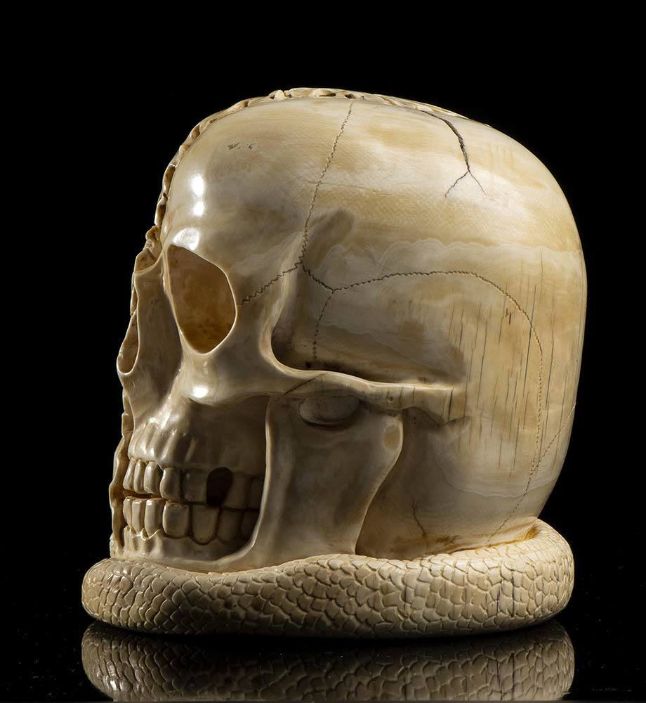 "Memento Mori", Vanitas rappresentata da un teschio in avorio di elefante (Loxodonta africana Blumenbach, 1797 o Elephas maximus Linnaeus, 1758) scolpito a tutto tondo e raffigurato con un serpente che si avviluppa alla parte inferiore della mascella per fuoriuscire dal globo oculare destro.