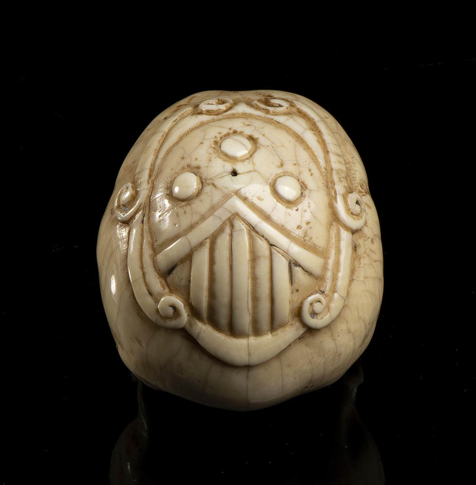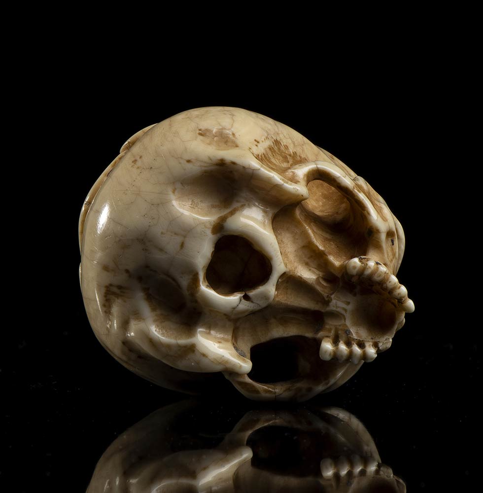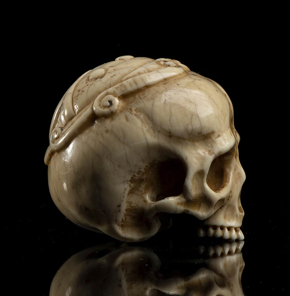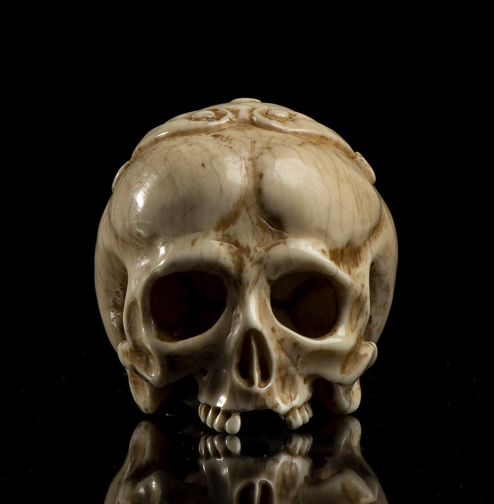 "Memento Mori", Vanitas rappresentata da un teschio in avorio di elefante (Loxodonta africana Blumenbach, 1797 o Elephas maximus Linnaeus, 1758) scolpito a tutto tondo; nella parte superiore uno stemma nobiliare.