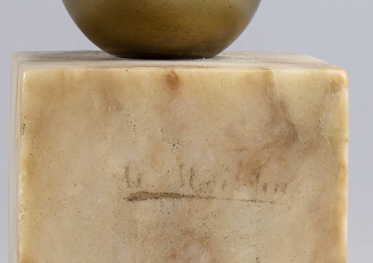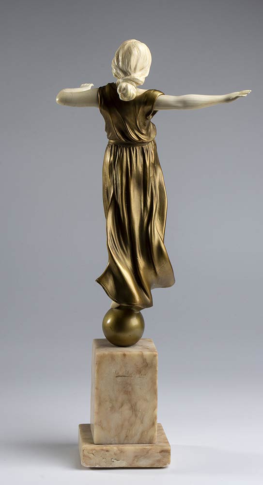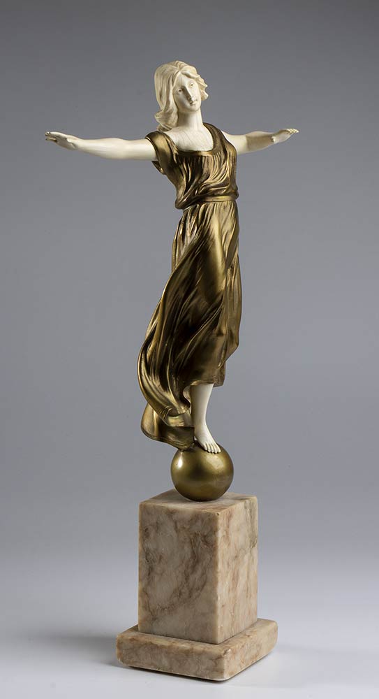 scultura criselefantina art déco in bronzo e avorio raffigurante una donna con testa, braccia e piedi in avorio di elefante (Loxodonta africana Blumenbach, 1797 o Elephas maximus Linnaeus, 1758) in equilibrio su una sfera, poggiante su una base in marmo recante la firma "Marten".