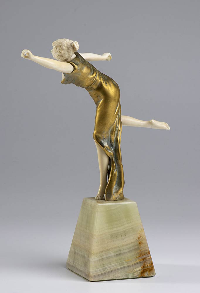 scultura criselefantina art déco raffigurante una ballerian con viso, braccia e gambe in avorio di elefante (Loxodonta africana Blumenbach, 1797 o Elephas maximus Linnaeus, 1758). Base troncoconica in alabastro firmata "Omerth".