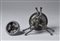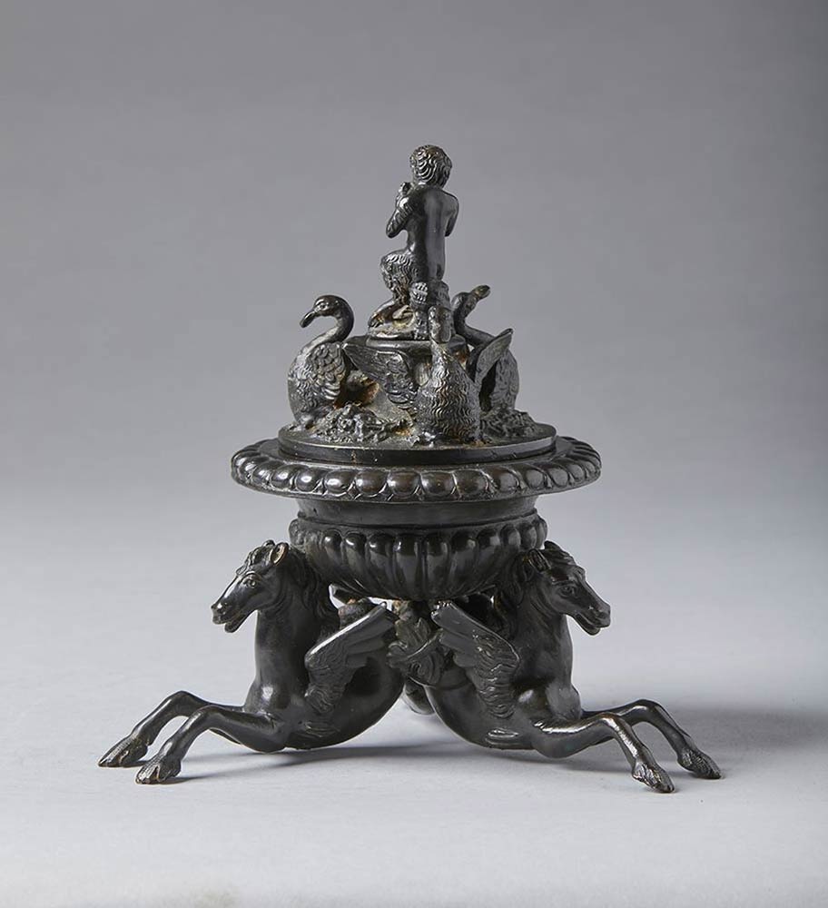 in bronzo patinato, coppa baccellata sorretta da tre ippocampi. Sul tappo altrettanti cigni con zampe palmate uniti da ghirlande. Un faunetto seduto con la siringa funge di presa per il tappo.