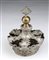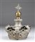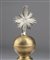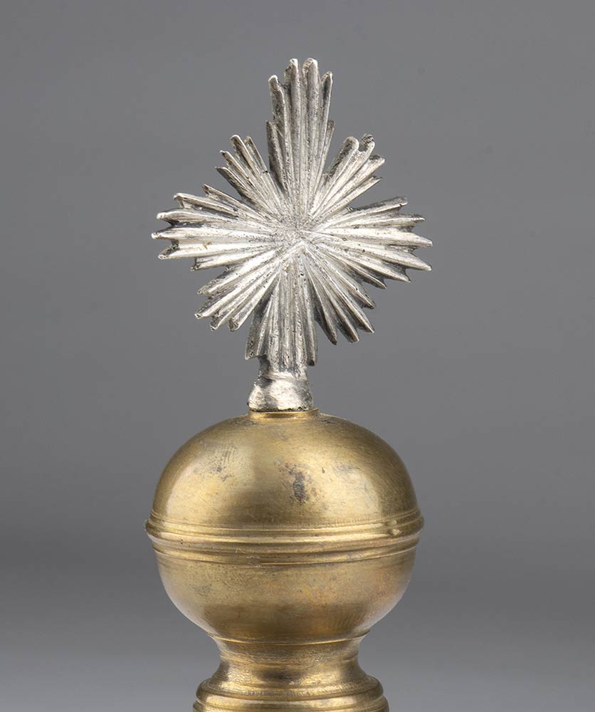 con motivo a giorno di grandi foglie d'acanto. La decorazione si sviluppa dalla base composta da un nastro circolare, si annodano al centro con un globo sormontato da una croce. Non punzonata.