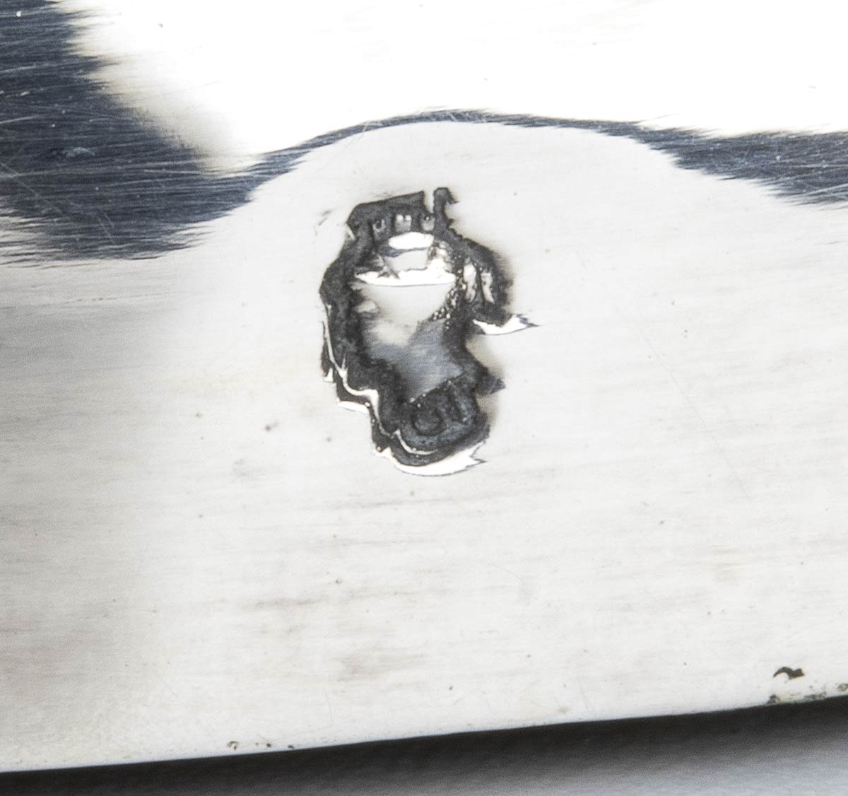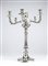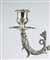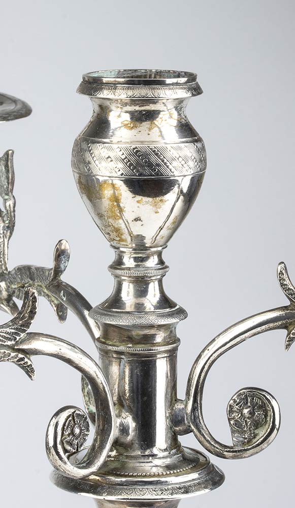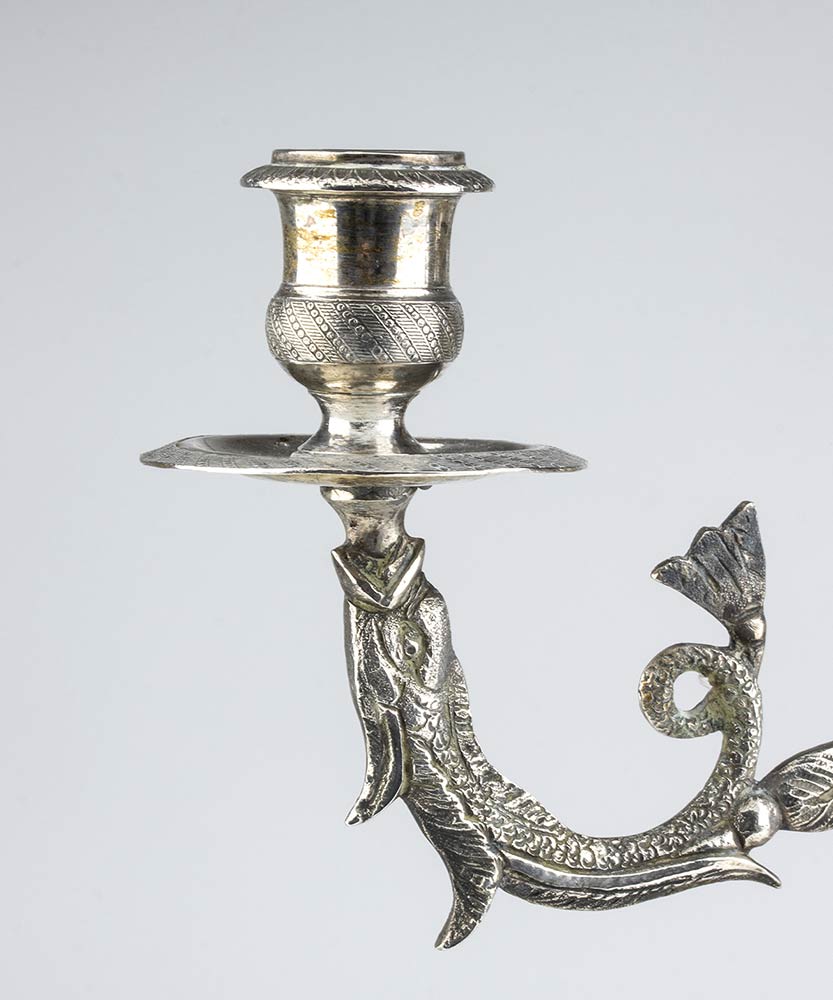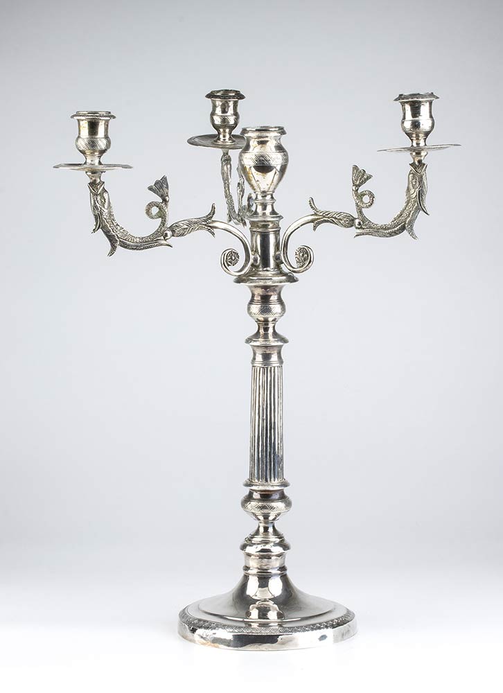 base circolare con fusto scanalato dal quale si dipartono tre braccia a forma di pesce. Argento 800/1000 punzonato con i marchi in uso in Italia dal 1872 al 1935.