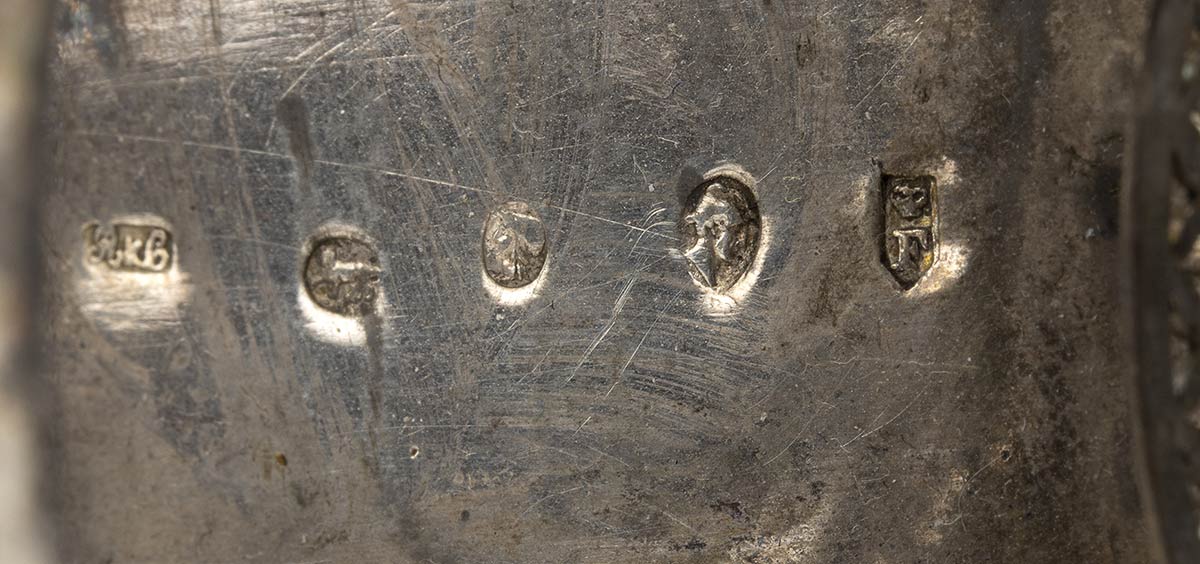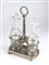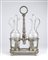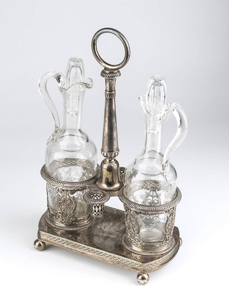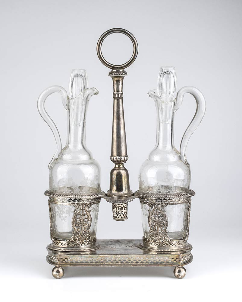 di forma sagomata, poggiante su quattro piedini fogliati; presa centrale con due ampolle laterali in vetro. Punzonata con marchi non identificati.