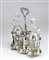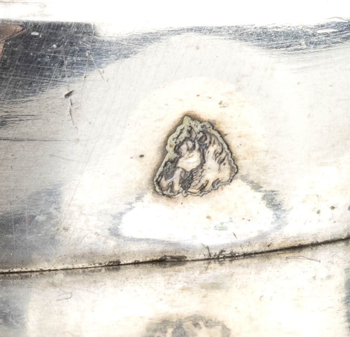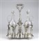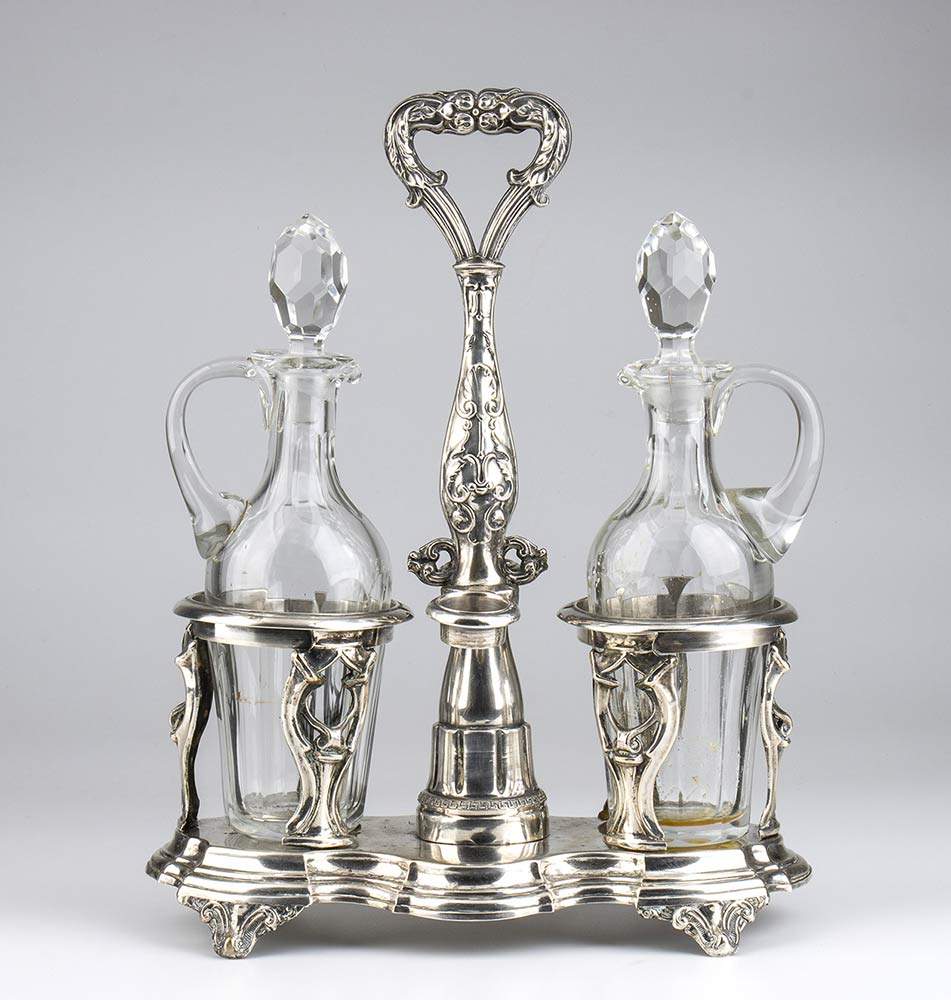 di forma sagomata, poggiante su quattro piedini fogliati; presa centrale con due ampolle laterali in vetro. Argento 800/1000, punzonata con i marchi in uso a Novara, Regno di Sardegna dal 1824 al 1872 e con il marchio dell'argentiere Canetti Federico opeante a Vercelli a partire dal 1824.