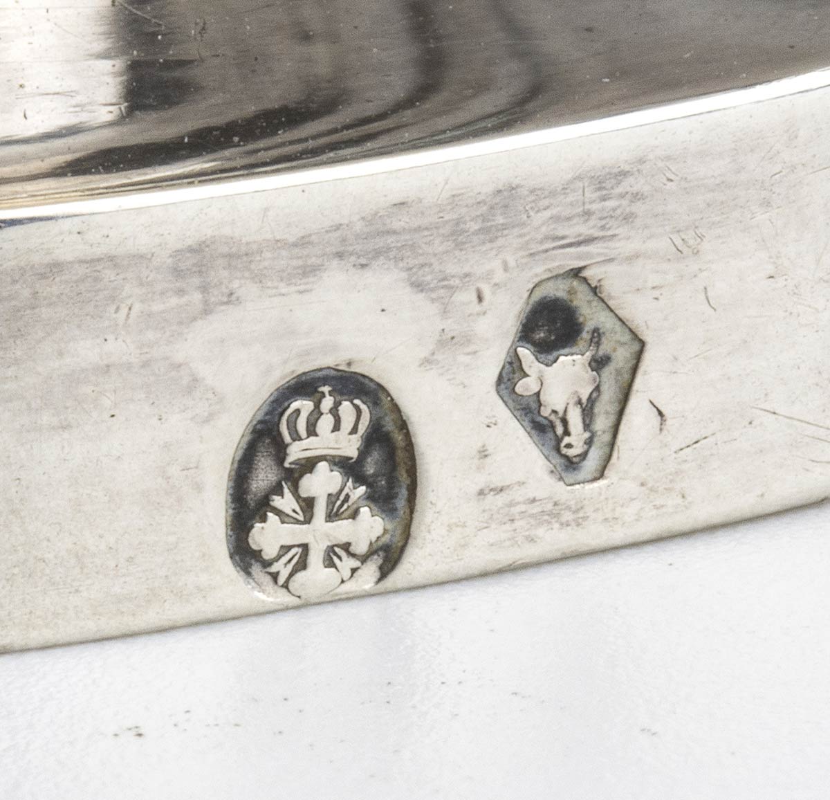 di forma sagomata, con manici laterali. Argento 800/1000, punzonata con i marchi in uso a Torino, Regno di Sardegna dal 1824 al 1872.