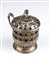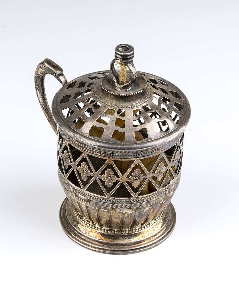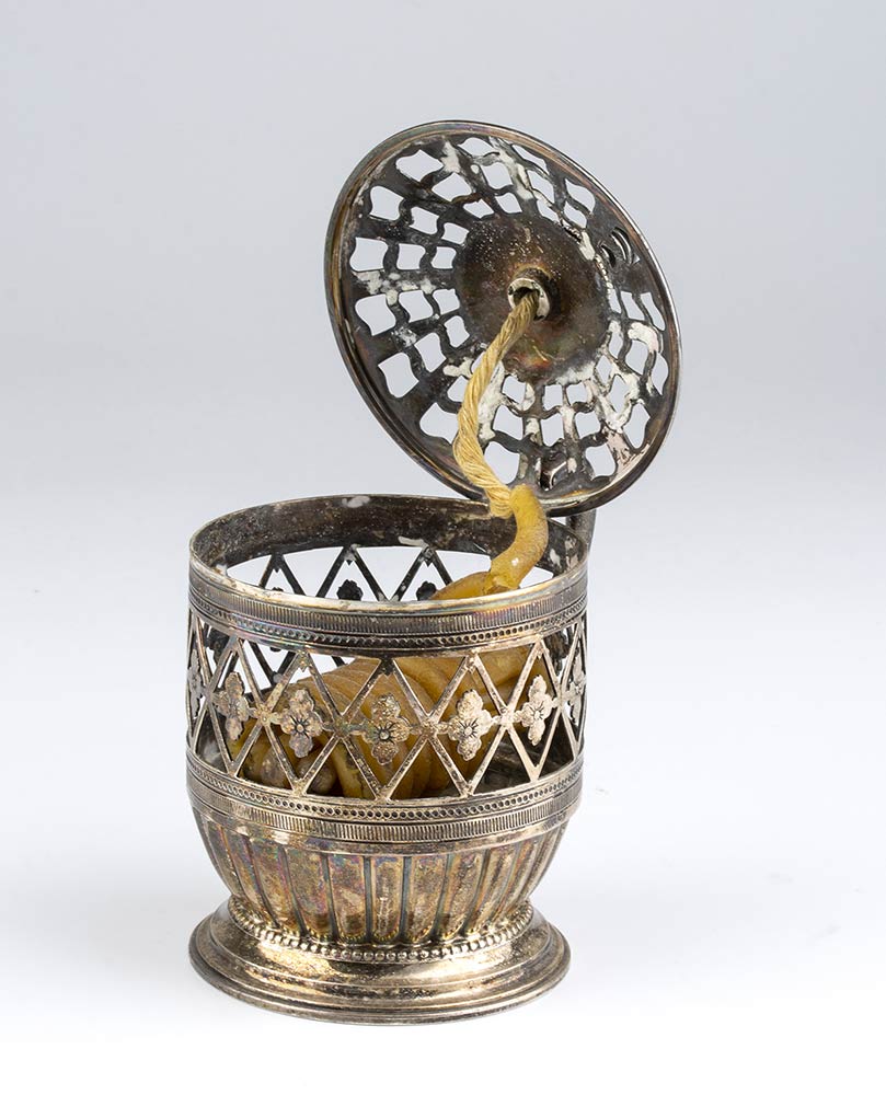 di forma circolare, realizzata a traforo con motivi geometrici e floreali, coperchio incernierato e manico ad ansa rialzata. L'avvolgicera centrale sostiene i resti di una bobina di cera.