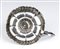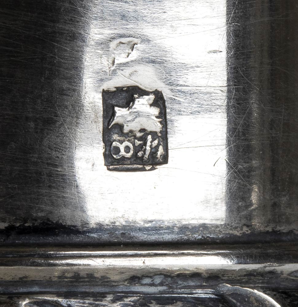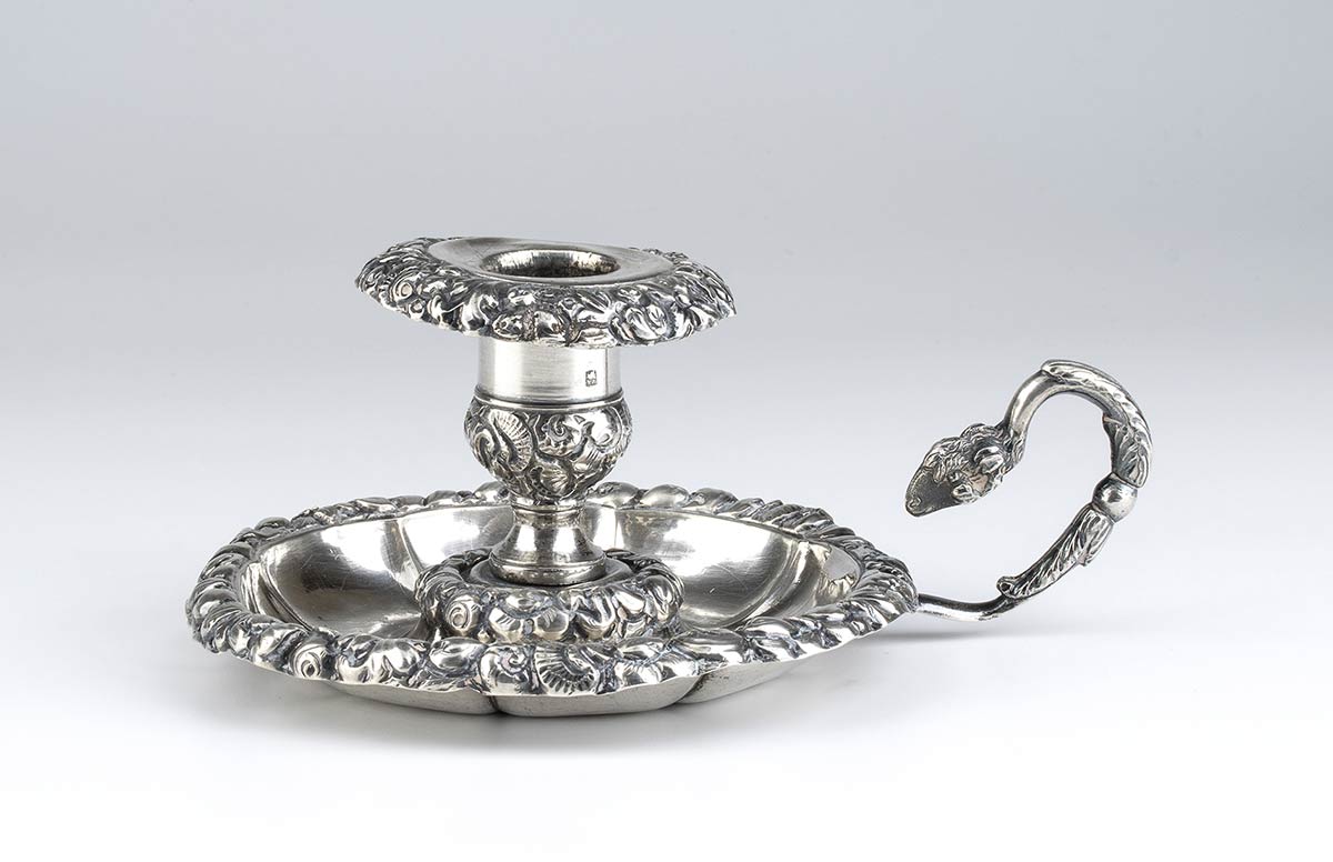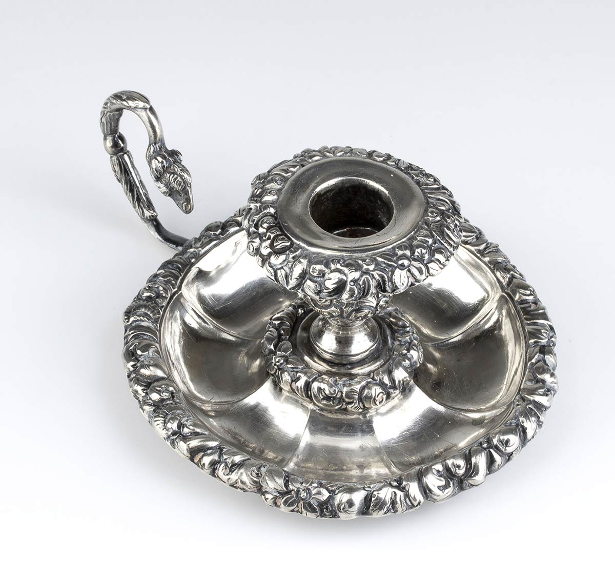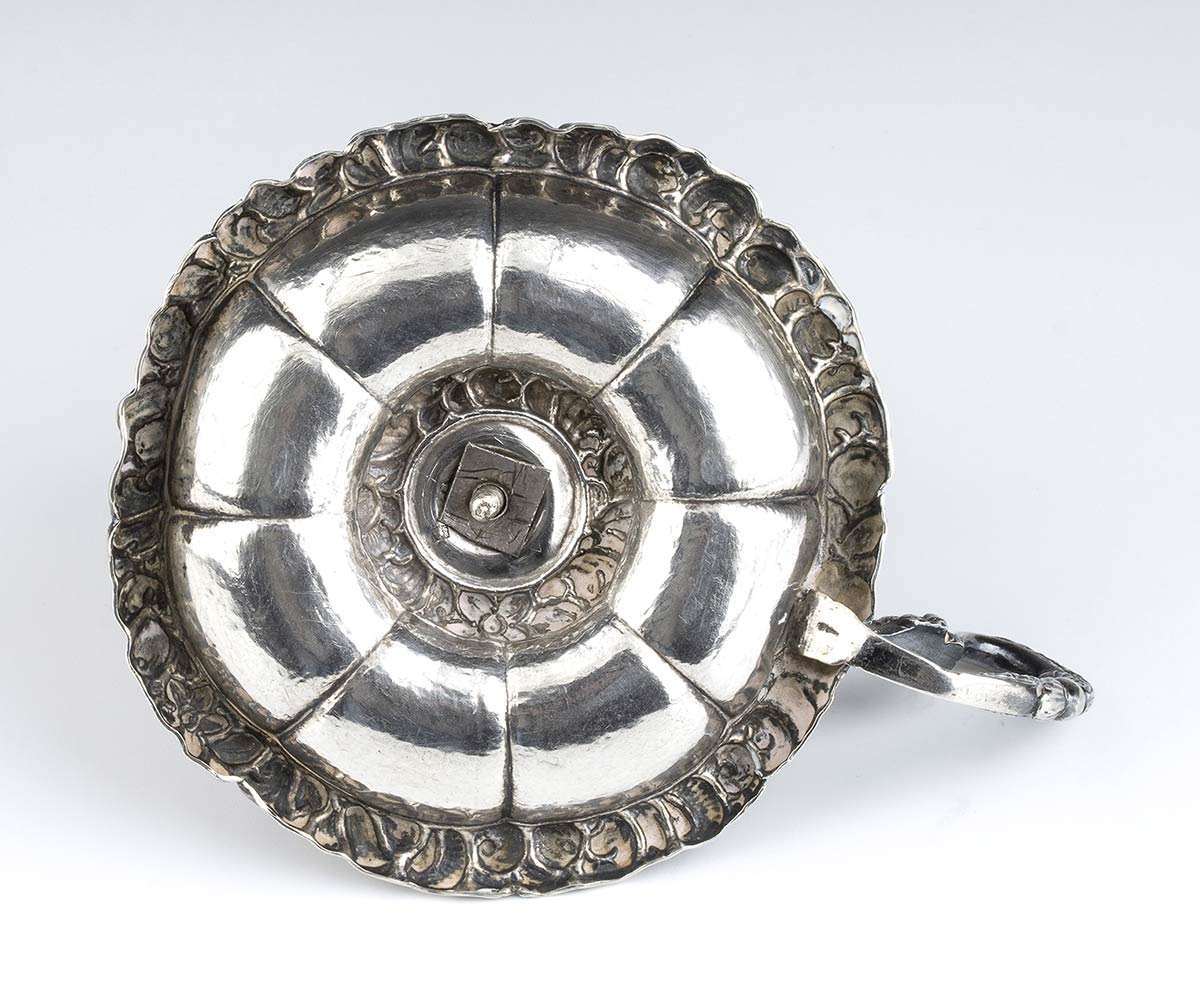 di forma circolare sbalzata e cesellata con motivo a "cocciolette", manico laterale. Punzonata con il marchio in uso alla corporazione degli orefici di Napoli per l'argento al titolo di 833/1000, 1832-1872, saggiatore Gennaro Mannara.