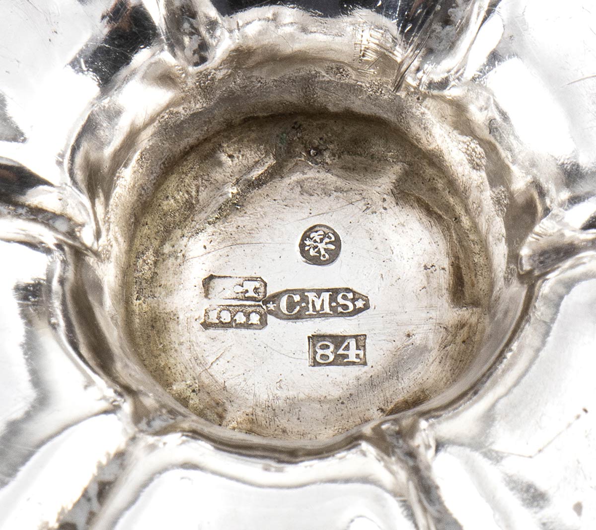 di forma circolare decorata con volute floreali. Serie completa di marchi per l'argento al titolo di 84 zolotniks (875/1000) in uso a San Pietroburgo nel 1879, argentiere Carl Magnus Stahle, assaggiatore Dimitry llyich Tverkoy (Rif.M.M. Postnikova-Loseva, nr 1418 pag. 281) .