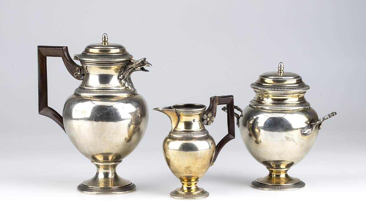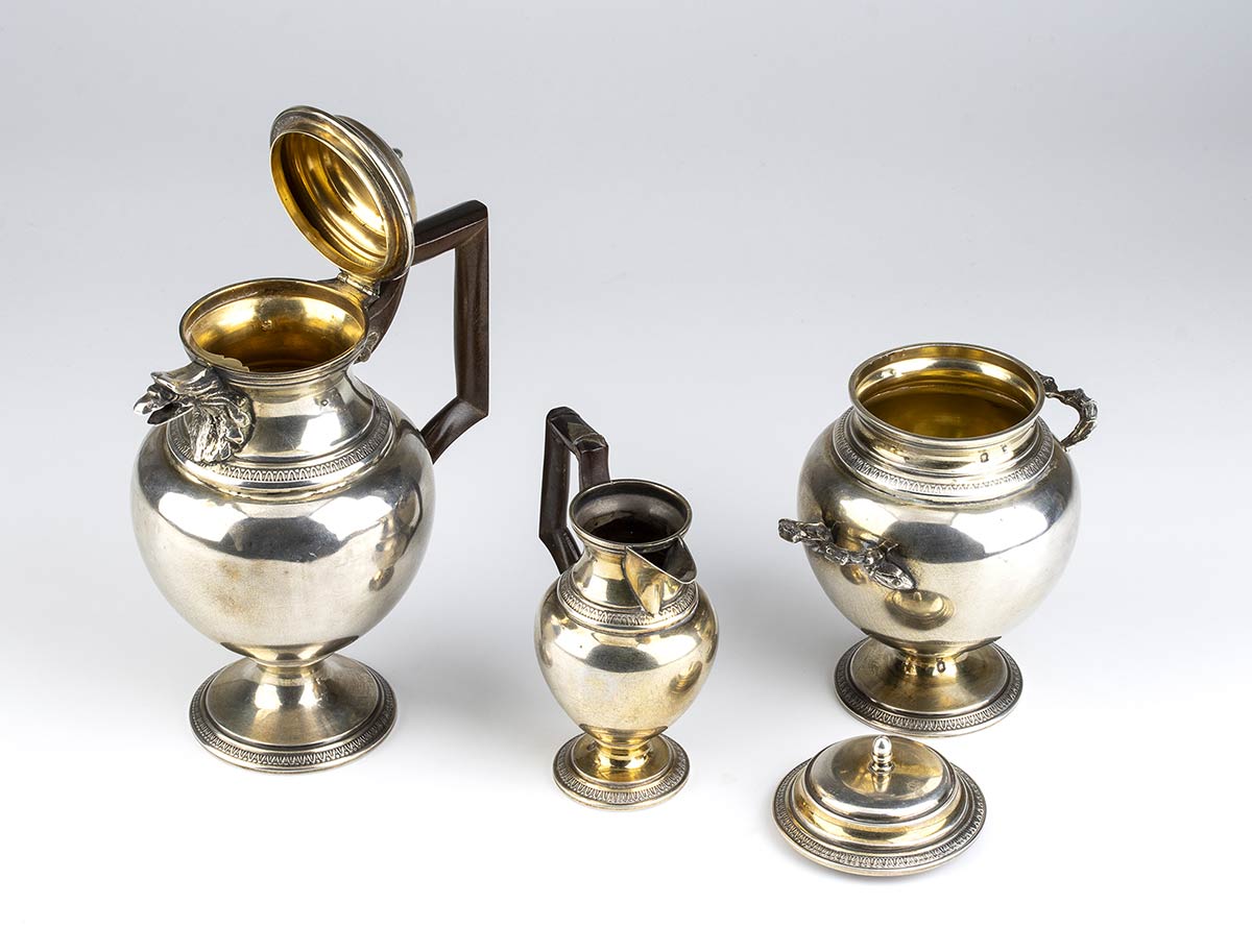 in stile neoclassico composto da una caffettiera, un bricco da latte ed una zuccheriera poggianti su piede circolare con decorazioni a palmette. Punzonati con marchi francesi post 1838 in uso a Parigi per l'argento 950/1000, argentieri "C * V"